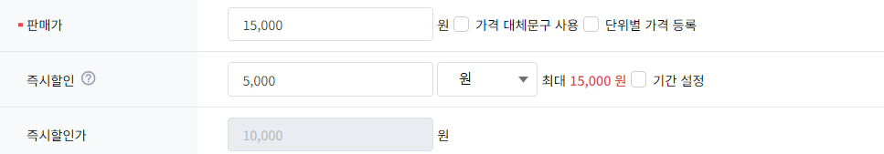 상품 등록시, 할인율 표기될 수 있도록 등록 부탁드립니다. 판매가 영역엔 [정상가] 즉시할인 영역엔 [정상가에서 희망 판매가를 제외한 차액] 즉시할인가 영역엔 [판매하고자 하는 특가]가 노출될 수 있게 등록해주세요.