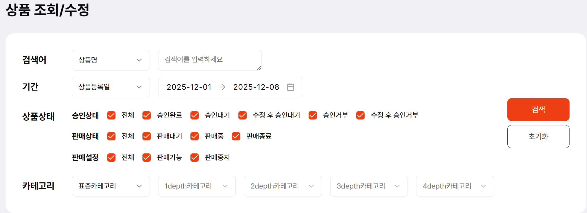상품 조회/수정 화면 상단에서는 다양한 조건으로 상품을 검색할 수 있습니다.