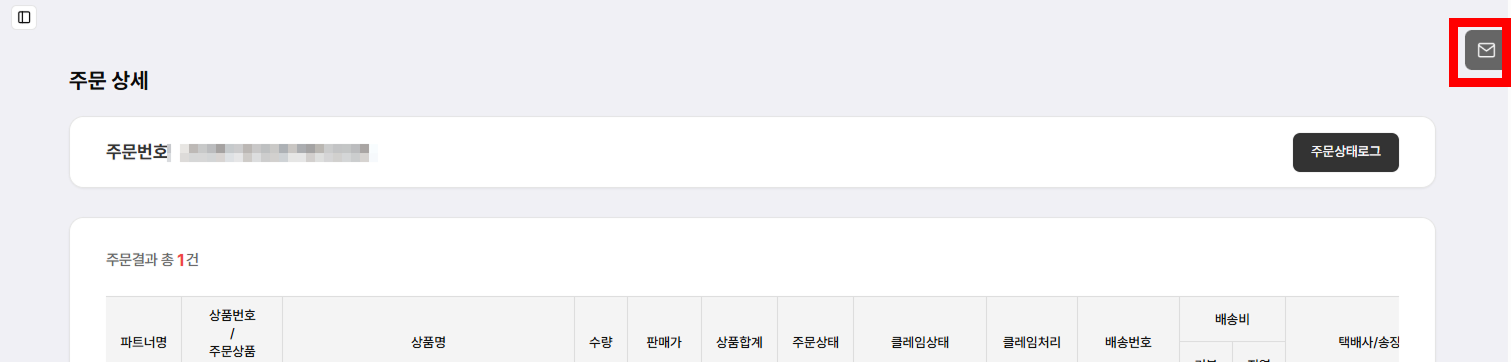 파트너어드민 접속 > 주문 관리 > 주문번호 클릭 > 우측 상단 편지 봉투 모양 아이콘 클릭 해 업무메세지에 하기 필수 항목 입력 > 등록