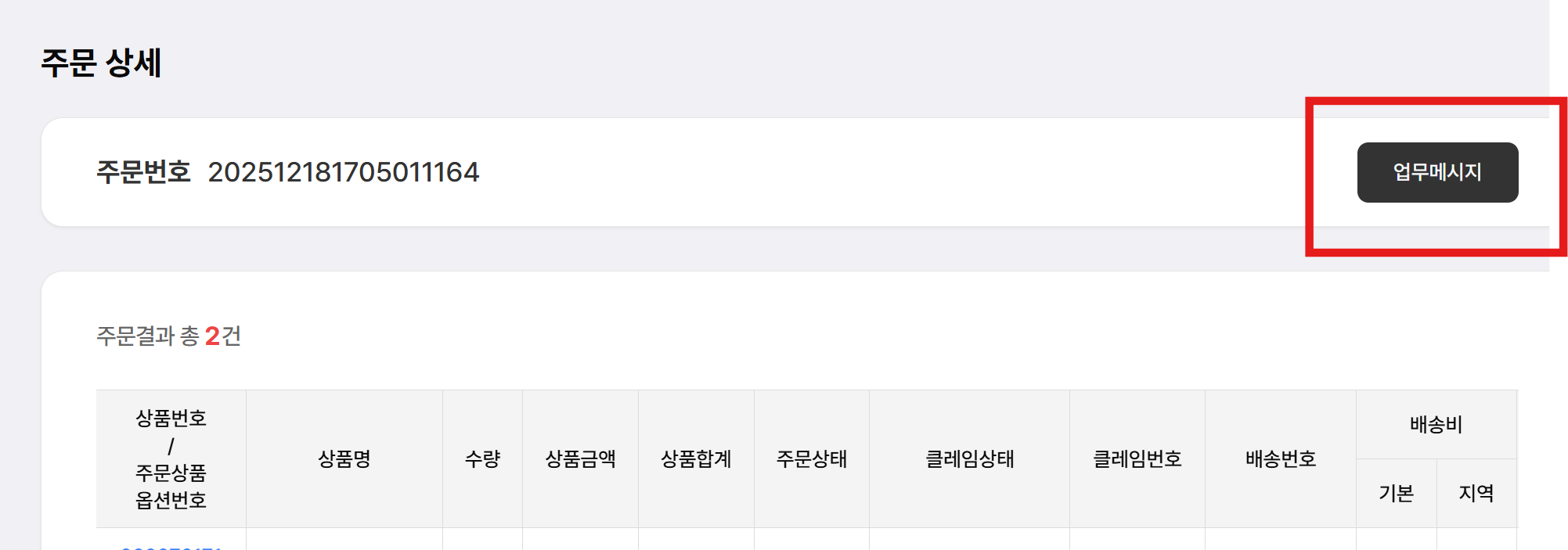 주문번호 우측의 [업무메시지] 버튼을 클릭하면→ 업무메시지 영역이 나타납니다. 다시 클릭하면 메시지 영역이 닫힙니다.
