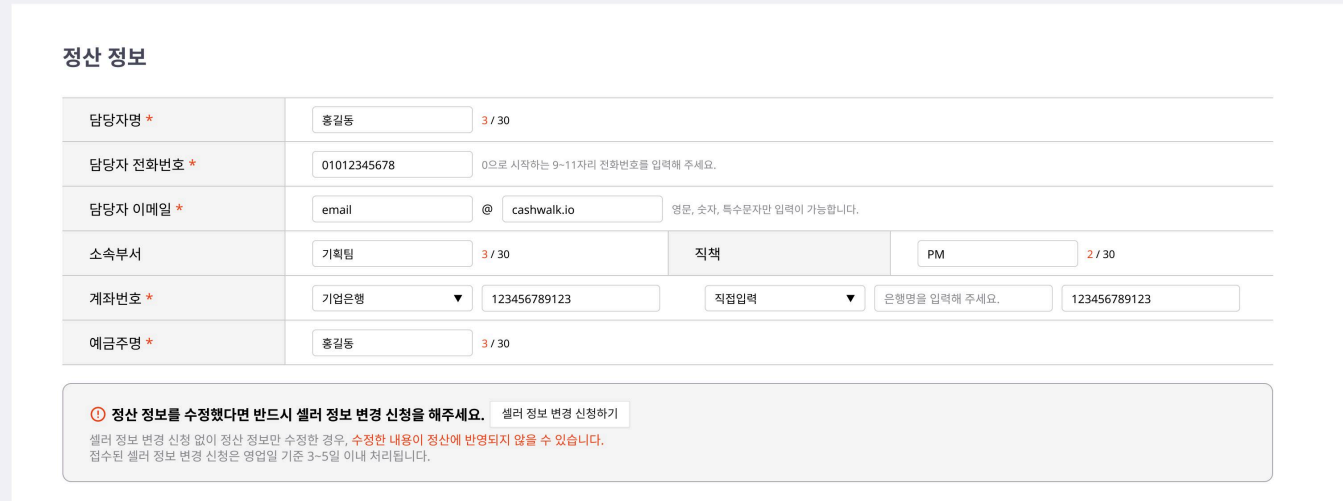 아래 셀러 정보 변경 신청서를 작성해주세요. 영업일 기준 3-5일 이내 처리될 예정입니다.