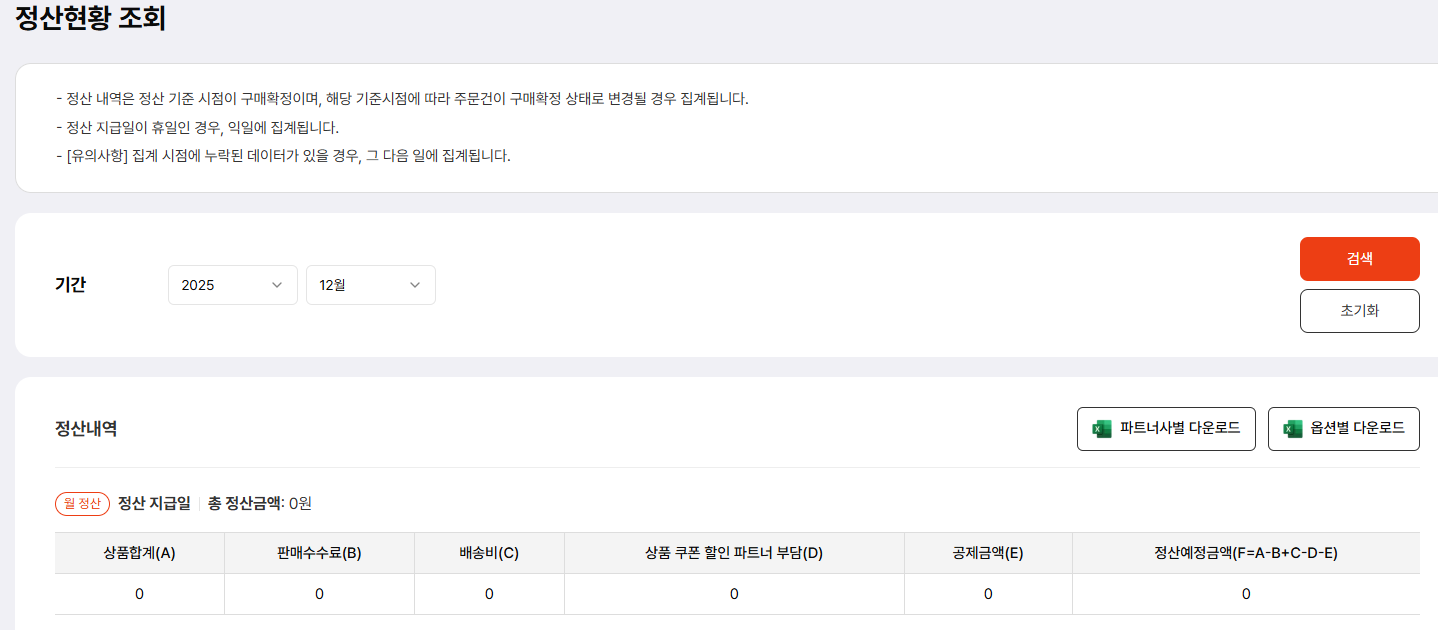 정산현황 조회는 판매한 상품에 대해 실제로 정산받을 금액을 확인하는 기능입니다. 주문, 취소, 반품, 환불 처리 결과가 모두 반영된 최종 정산 기준 데이터를 확인할 수 있습니다.