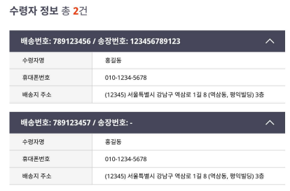 주문에 배송번호가 여러 개 존재할 수 있어, 배송번호별로 수령자 정보가 나뉘어 표시됩니다.