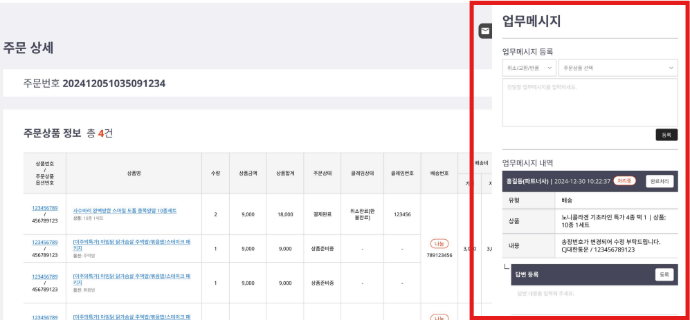 주문 상세 화면에서는 특정 주문에 포함된 상품, 결제 정보, 배송 정보, 주문자·수령자 정보를 한눈에 확인하고,필요한 경우 송장번호 등록, 업무메시지 작성, 상품 단위 처리 상태 확인 등을 할 수 있습니다.