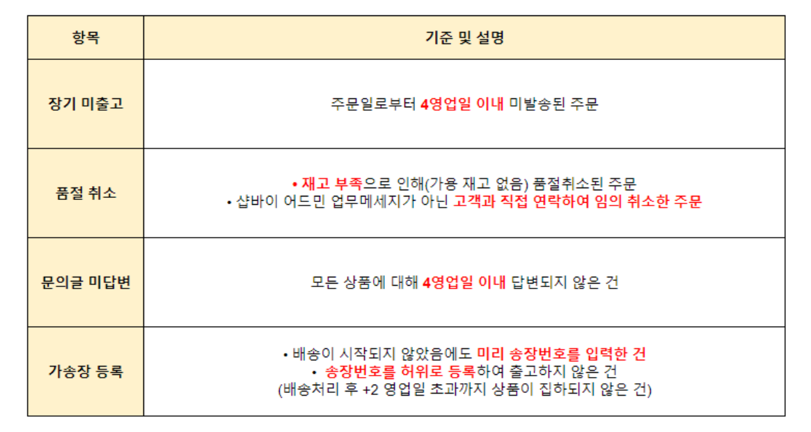 • 송장번호를 허위로 등록하여 출고하지 않은 건 (배송처리 후 +2 영업일 초과까지 상품이 집하되지 않은 건)