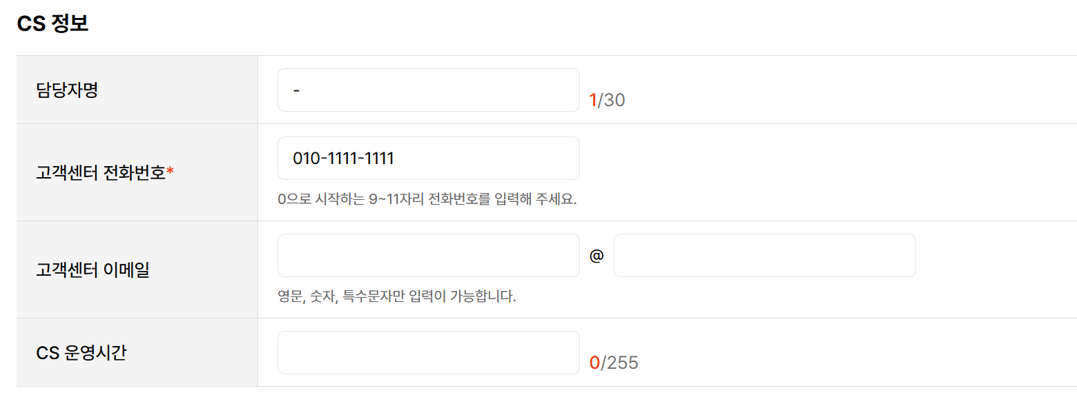 [기초정보 관리] > [파트너사 정보] > [주소] 항목 내 ‘셀러 고객센터 번호’ 기입