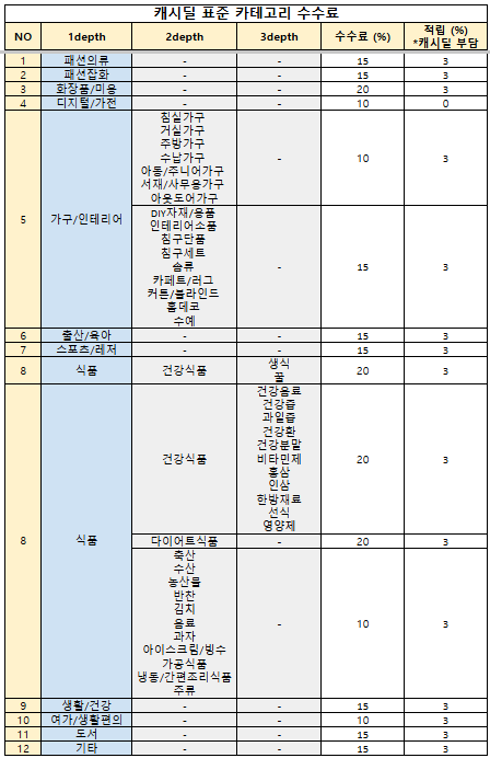 • 캐시딜은 "표준카테고리"를 기준으로 수수료 운영됩니다. (전시카테고리 X)