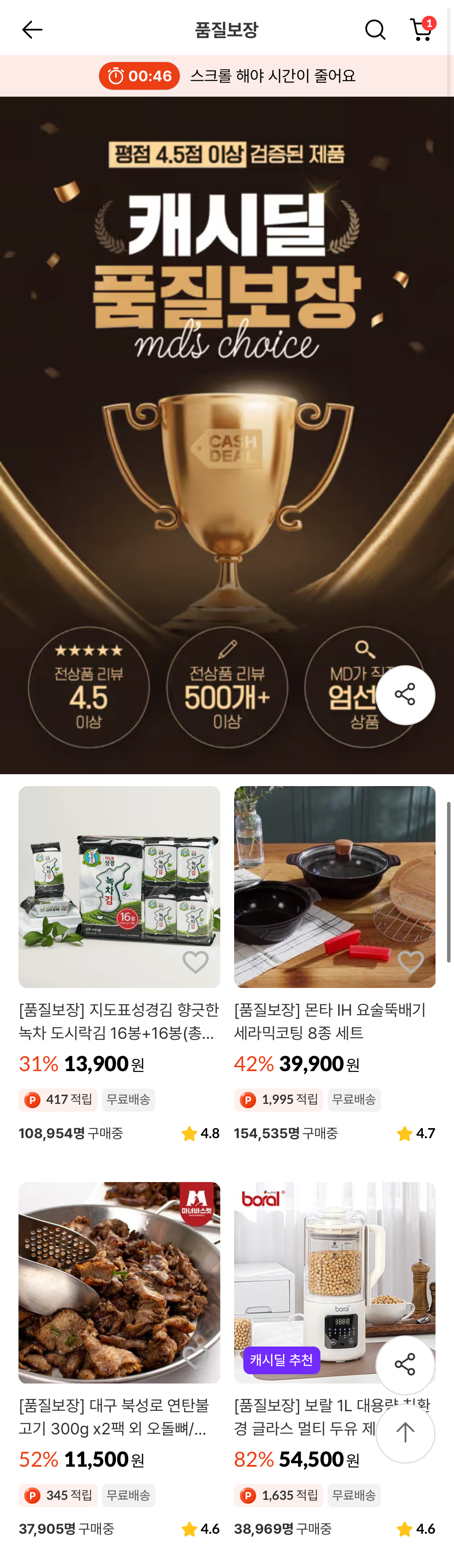 캐시딜에서 "리뷰" 500개 이상 / 별점 4.5 이상 상품 (리뷰 500개 이하 상품 불가)