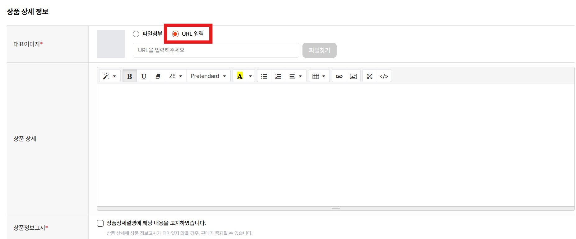 상품 이미지(대표이미지, 리스트이미지)는 파일 등록, URL 등록(HTML 등록)이 가능합니다.