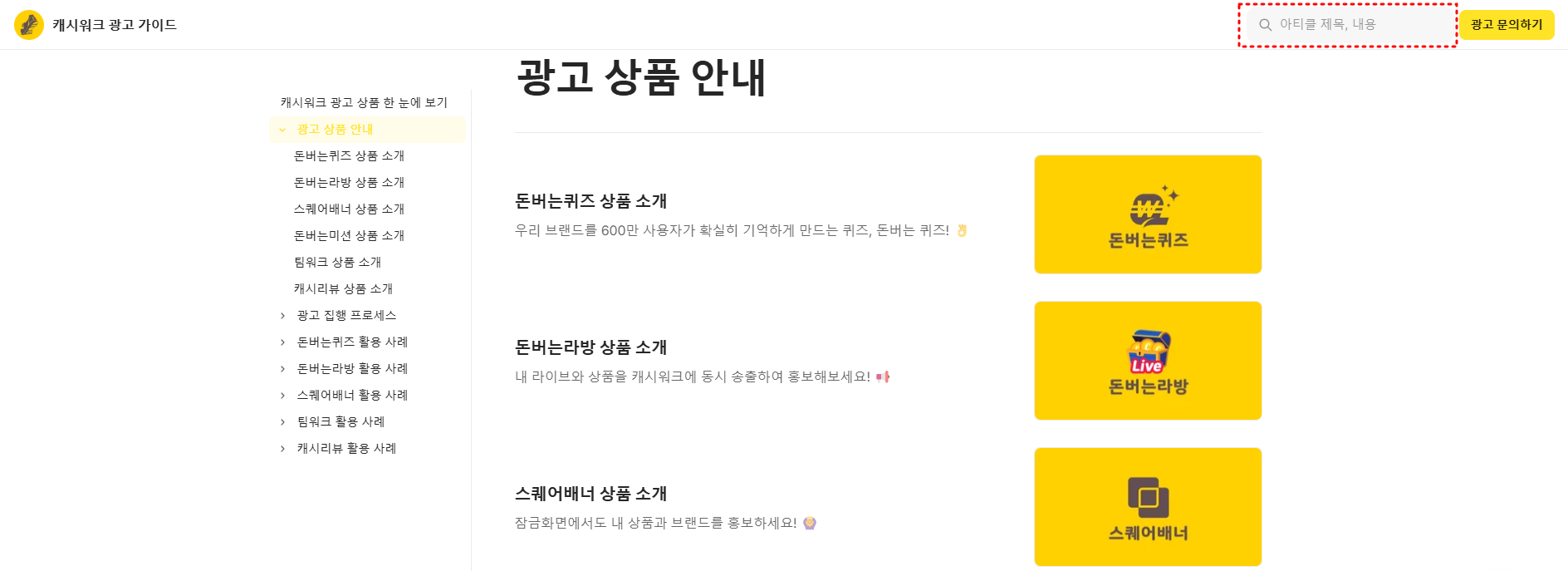 자세한 내용은 매체별 [광고상품소개서] 확인 부탁드리며, 그 외 사항은 캐시톡으로 문의 바랍니다.
