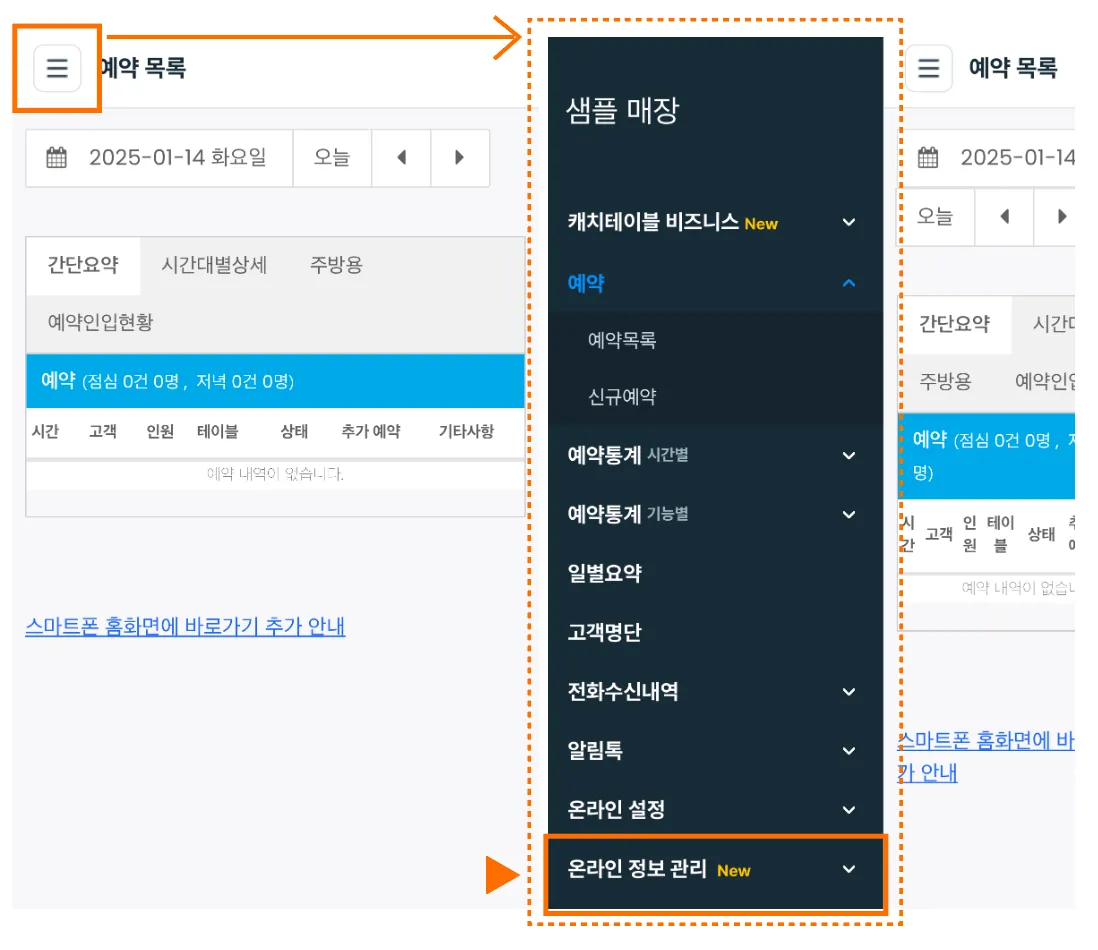** 단, 예약 시스템 (예약 시 노출되는 메뉴 등) 설정은 캐치테이블에 문의 접수 부탁드립니다.