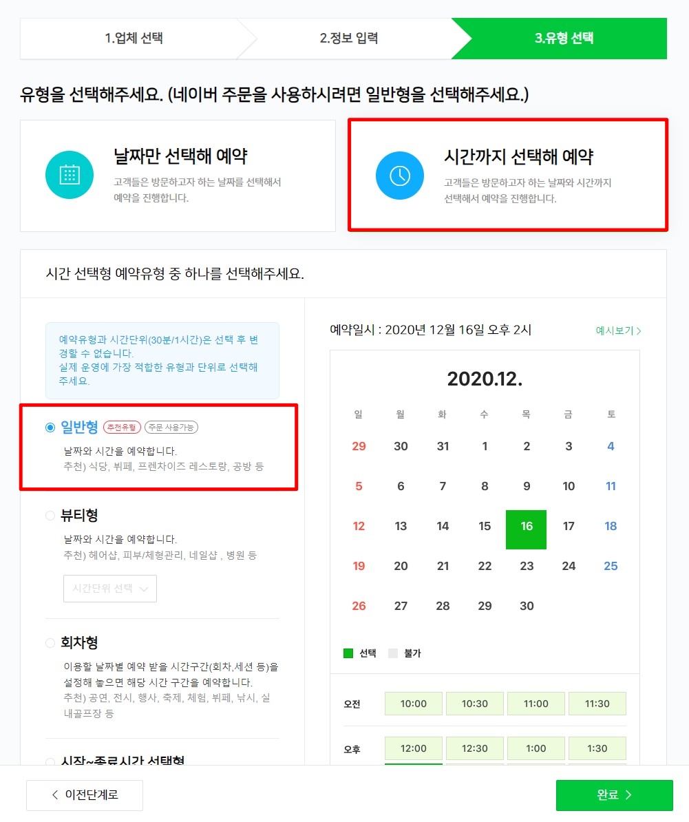 네이버 예약 생성 시 마지막 단계 유형 선택에서 선택하실 수 있습니다. (두 번째 사진 참고)