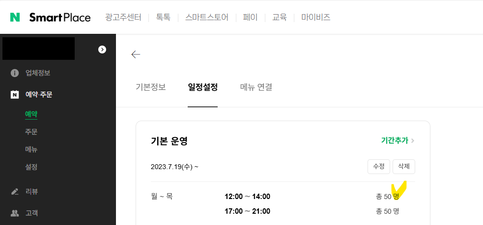 내 업체 > 예약/주문 > 예약 > 예약상품 > 상품 선택 후 일정설정 > 기존 운영 '명'수 확인!