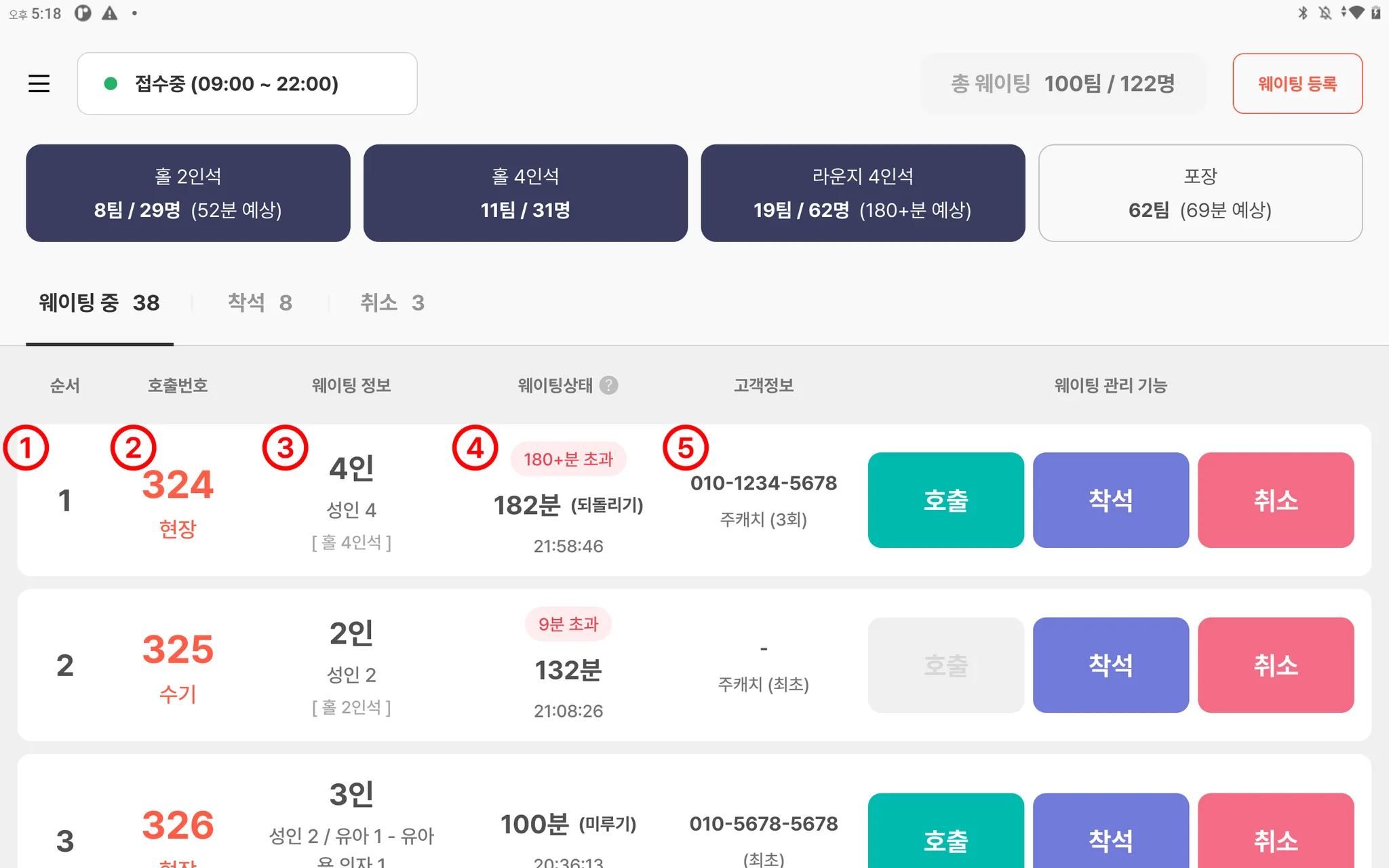 빨간색호출번호 : 입장대기 메시지를 수신한 웨이팅을 의미합니다.