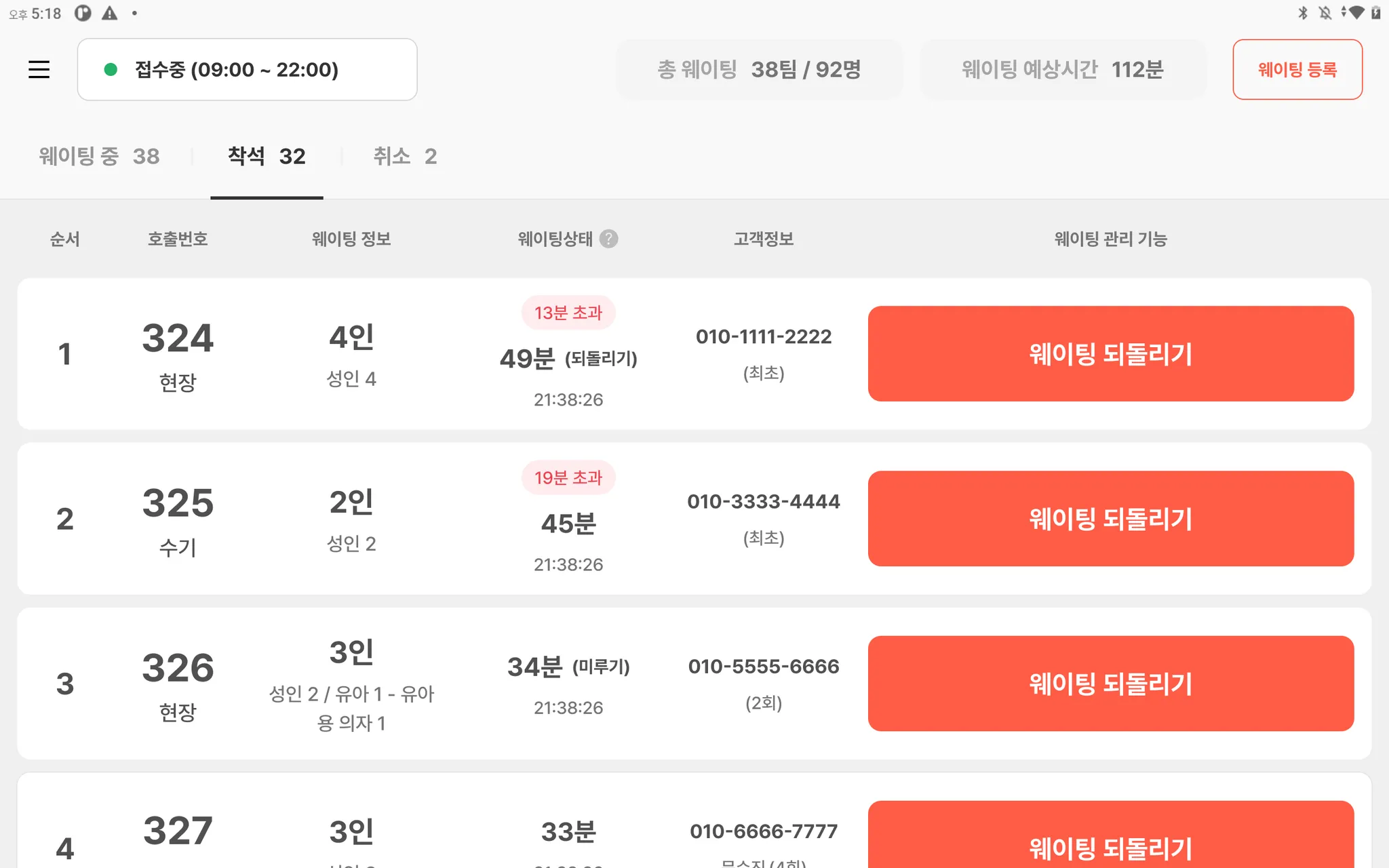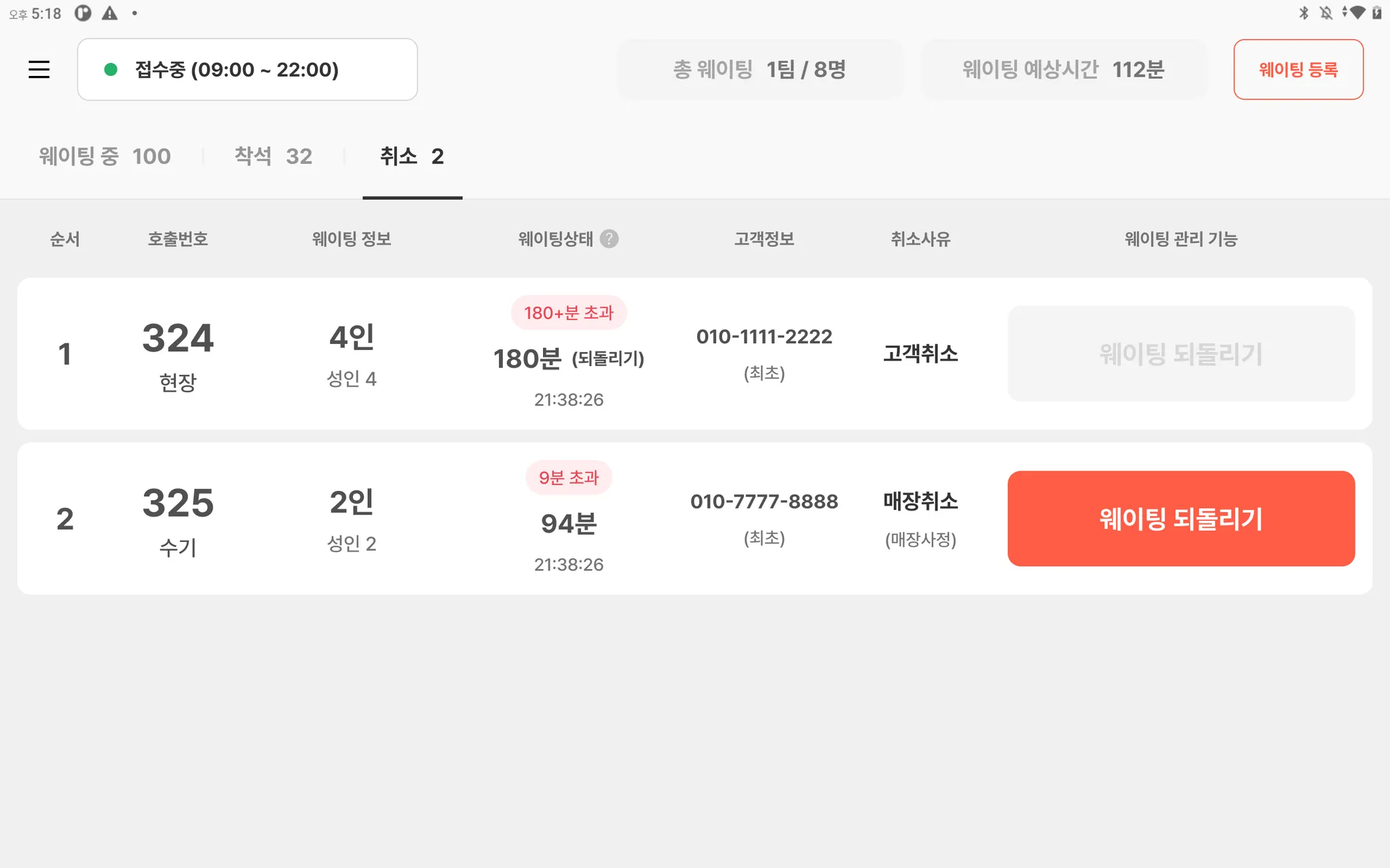 웨이팅을 등록한 고객의 정보를 확인할 수 있어요.