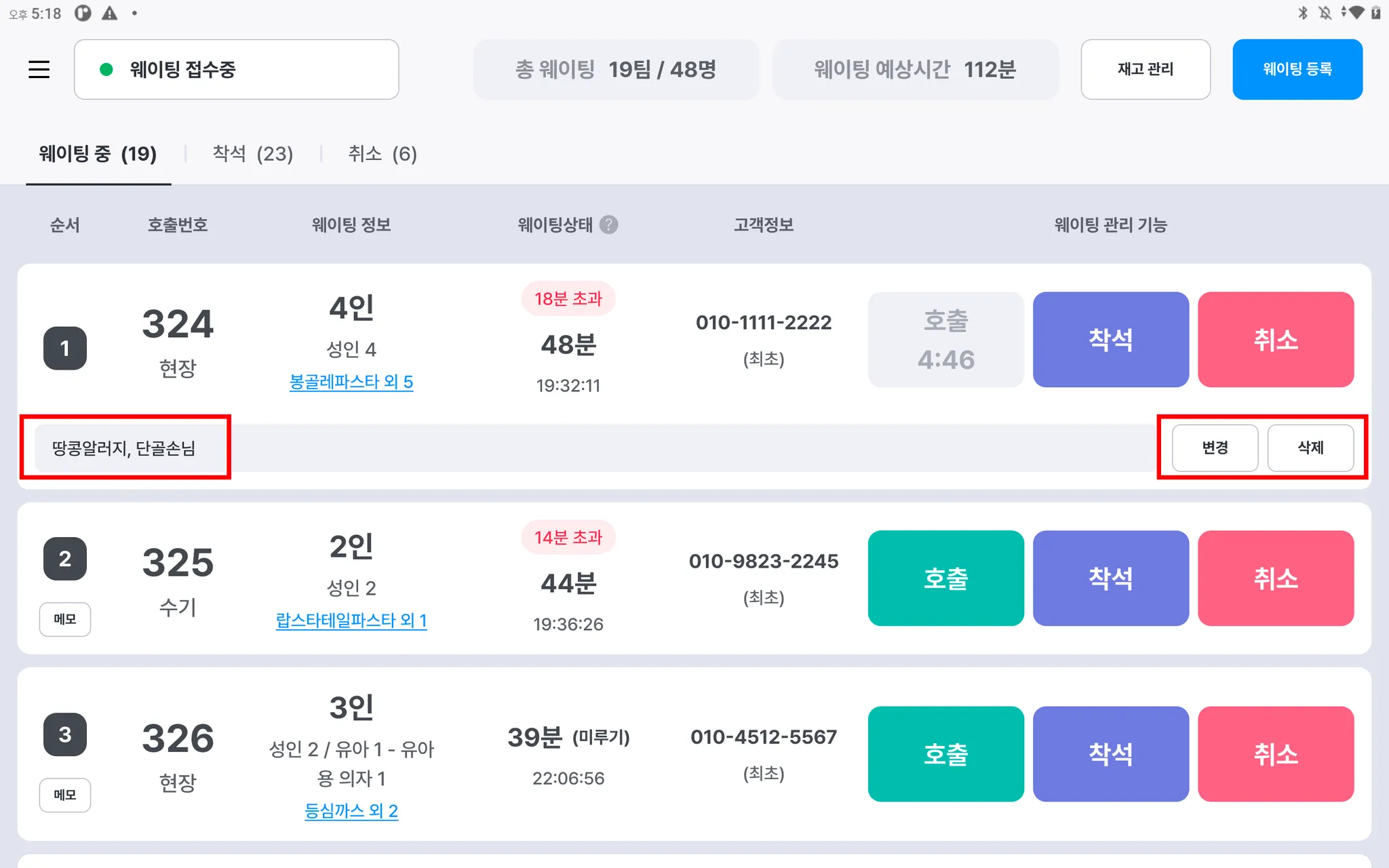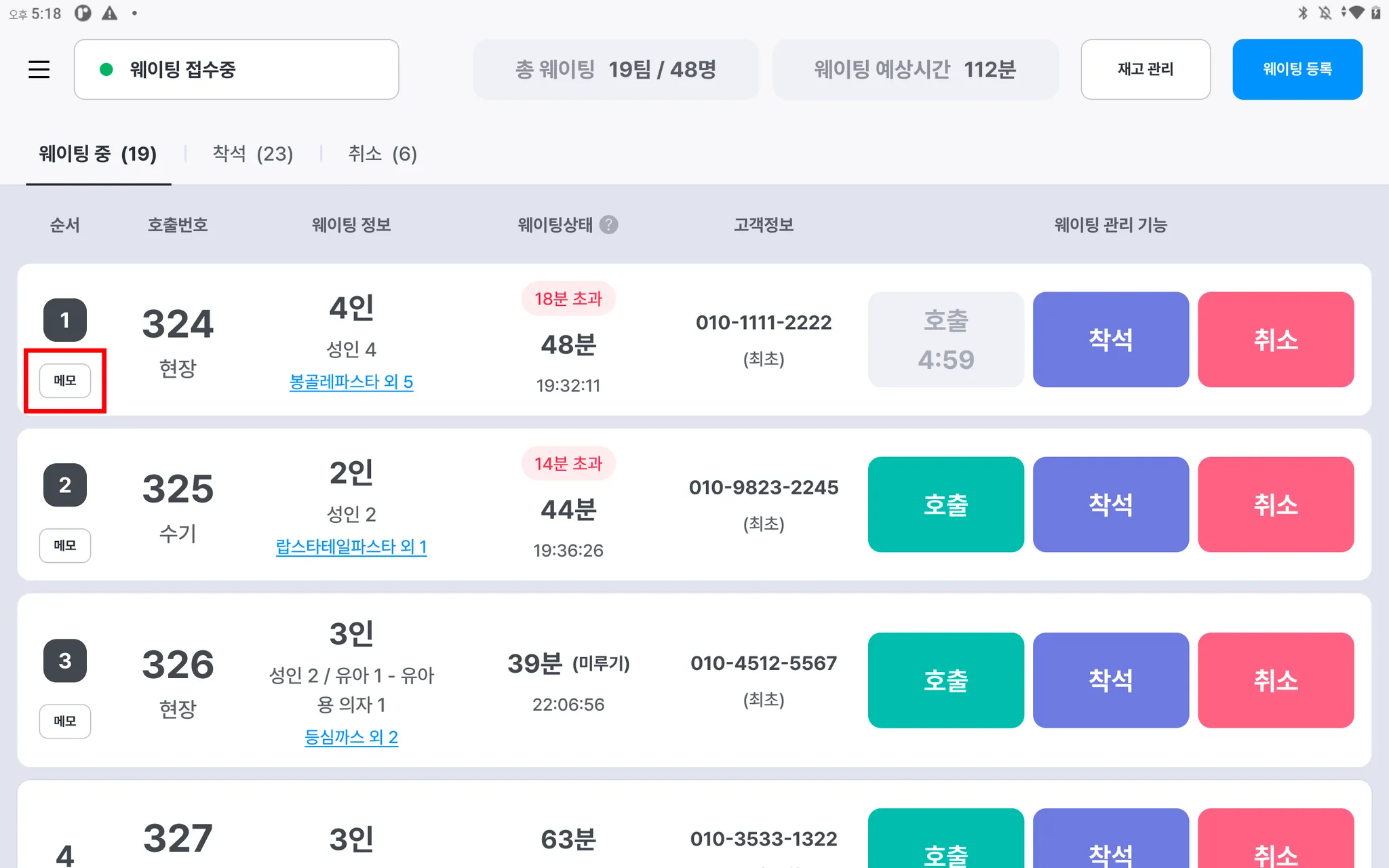 접수된 웨이팅건에 요청사항들을 따로 메모해보세요!