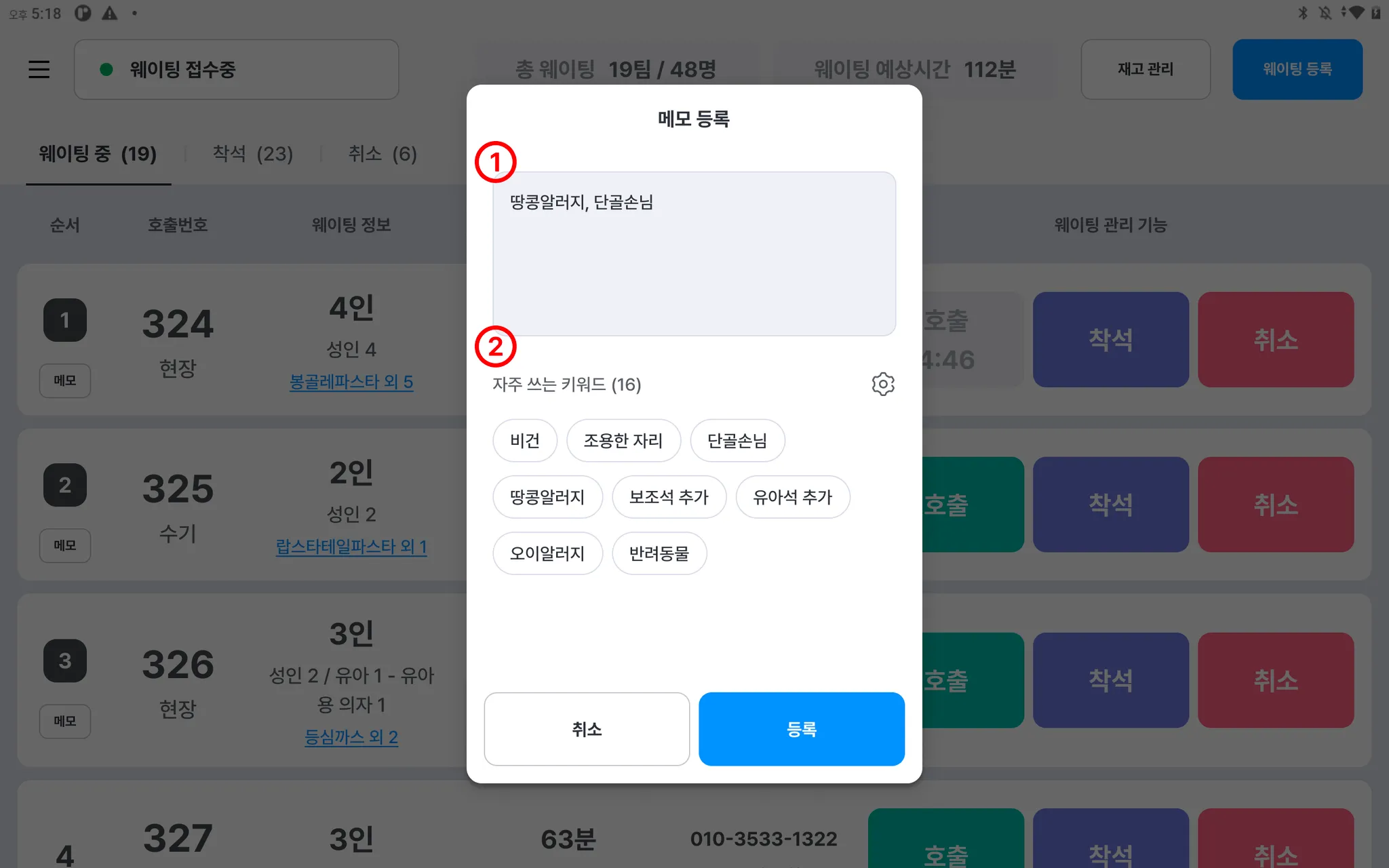 [웨이팅 설정 > 메모 설정]에서 자주 쓰는 키워드 설정 후 선택 가능해요