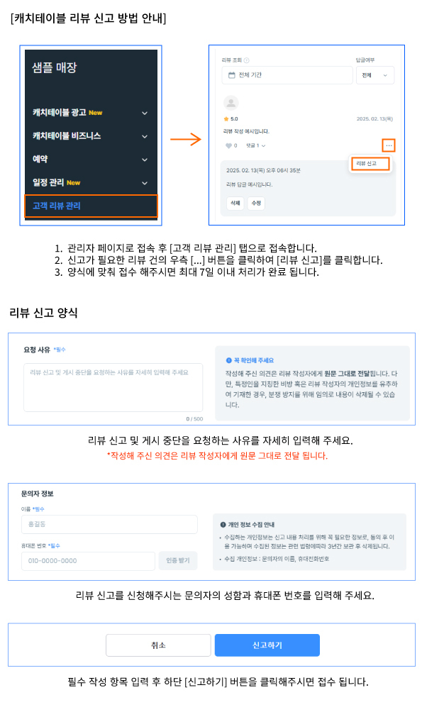 초상권 침해, 다른 매장의 리뷰 오작성 등 수정이 필요한 경우 : 작성자에게 수정 요청 (미수정 시 삭제)