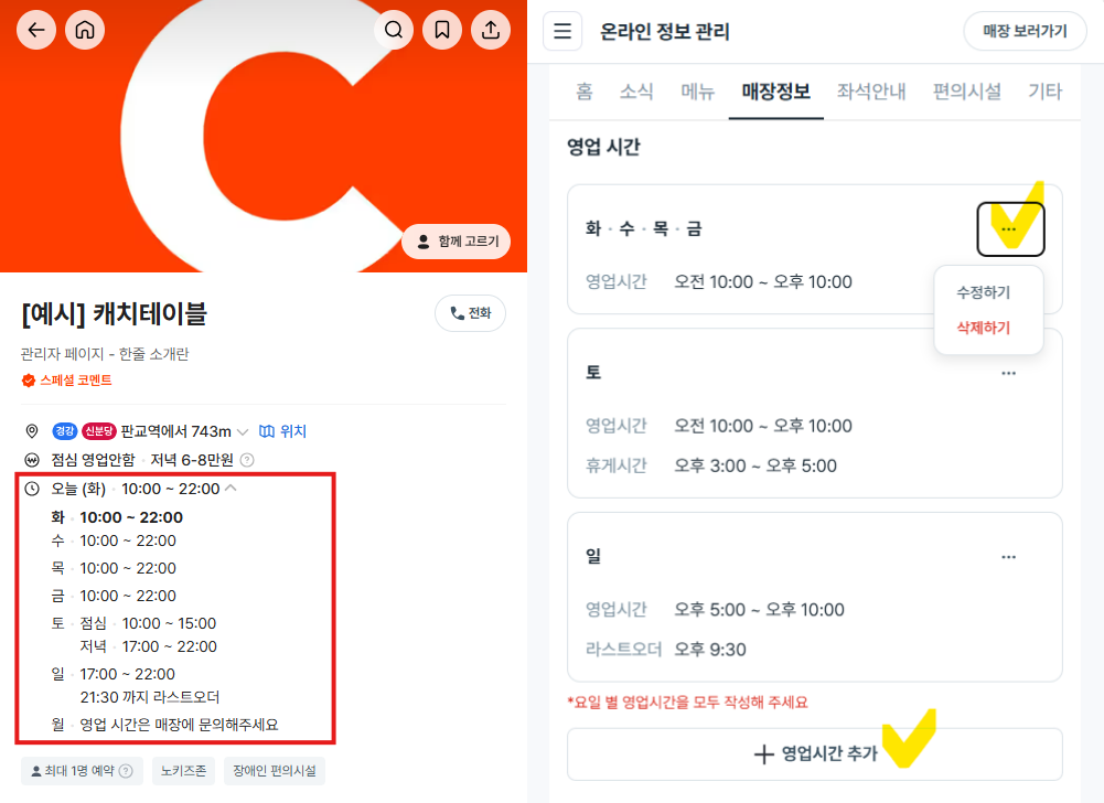 우측 점 […] 선택 후 [수정하기] 또는 [영업시간 추가]를 통해 요일 별 영업시간을 설정할 수 있습니다.