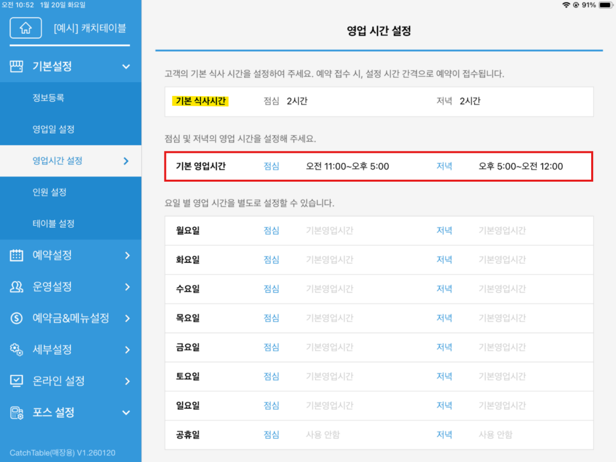 A. 예약 서비스 가입 매장에서 아이패드로 확인하시는 기본 영업시간의 경우,