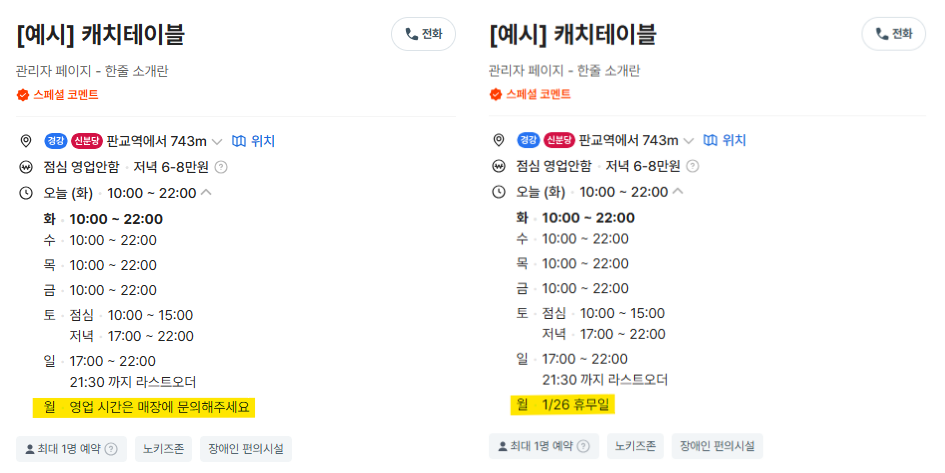 A. 영업시간 문구는 정보성 문구로, 실제 영업/휴무일 설정과는 무관합니다!