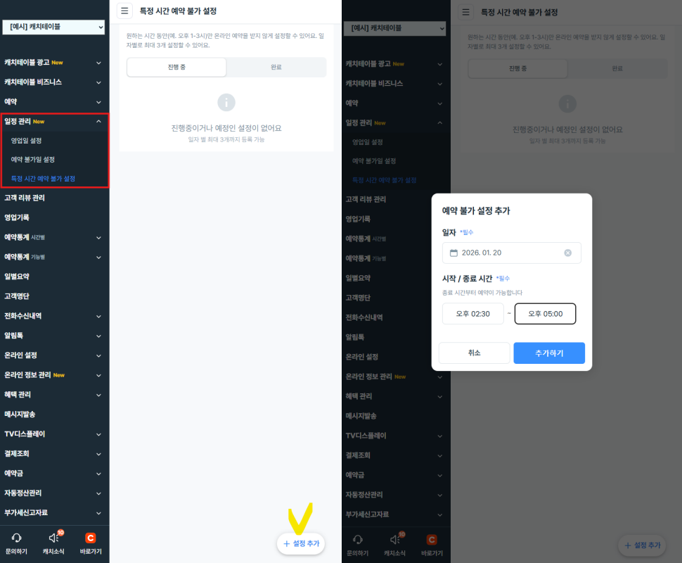 (위치 : 관리자 페이지 > 일정 관리 > 특정 시간 예약 불가 설정 > 설정 추가)