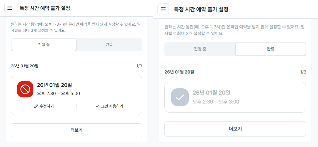예약 마감 처리를 희망하시는 일자와 시작/종료 시간 선택 후 추가하기로 설정이 가능합니다.