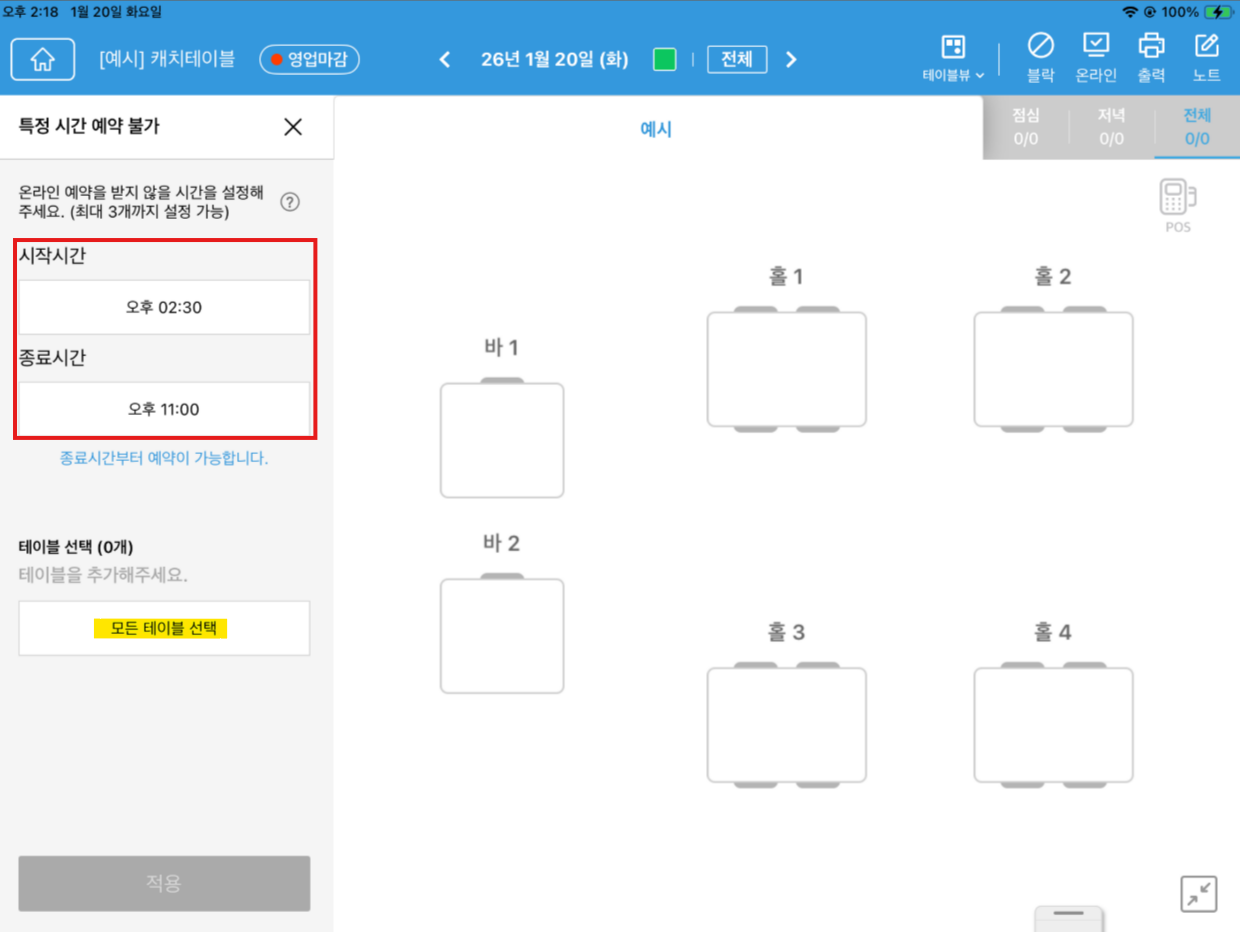 (특정 시간의 전체 예약 불가 처리를 희망하신다면, 모든 테이블 선택해 주세요.)