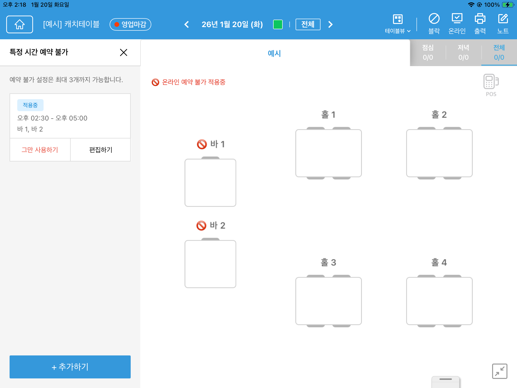 완료된 설정은 테이블뷰에서 '온라인 예약 불가 적용중'으로 노출됩니다.