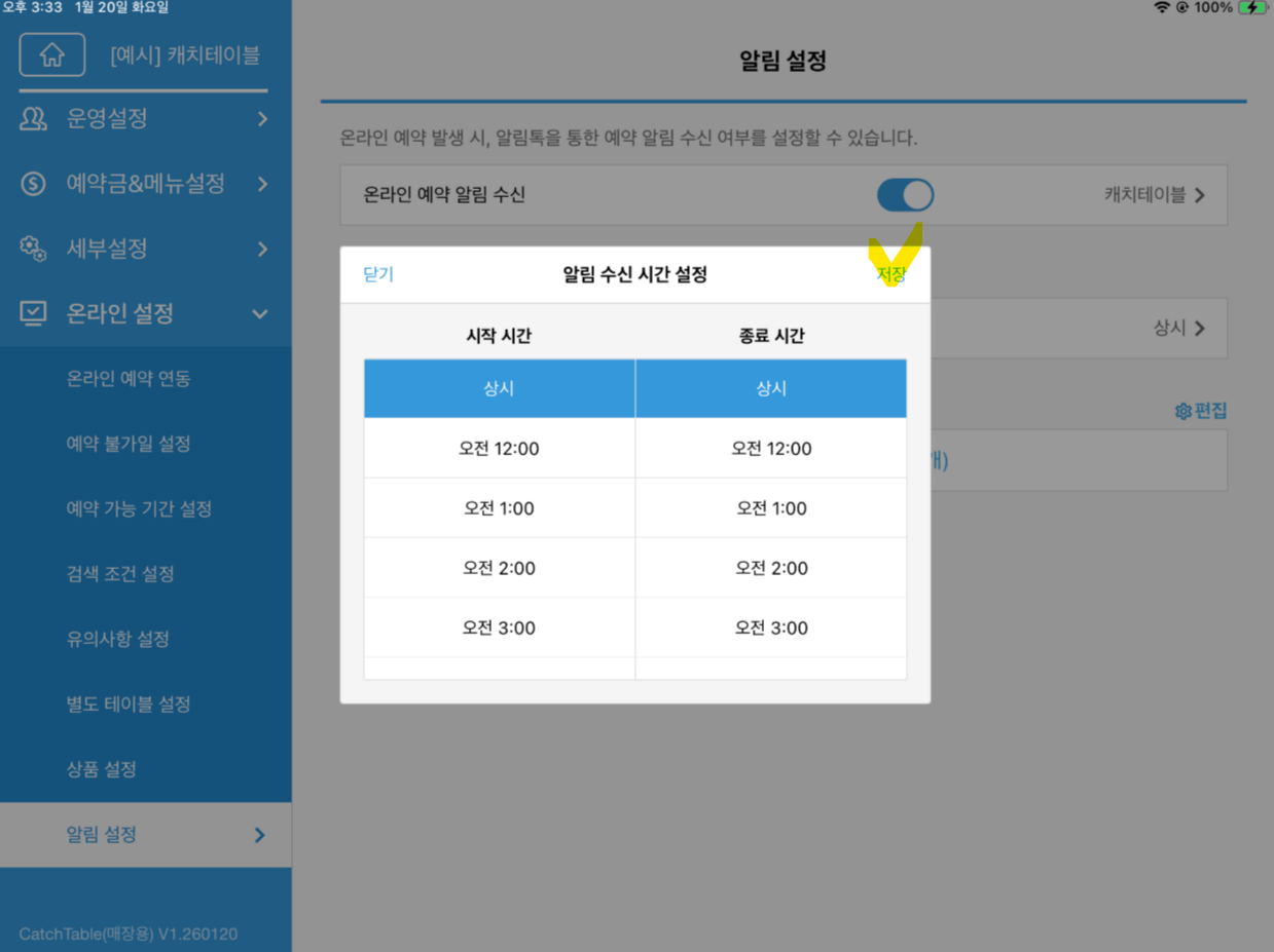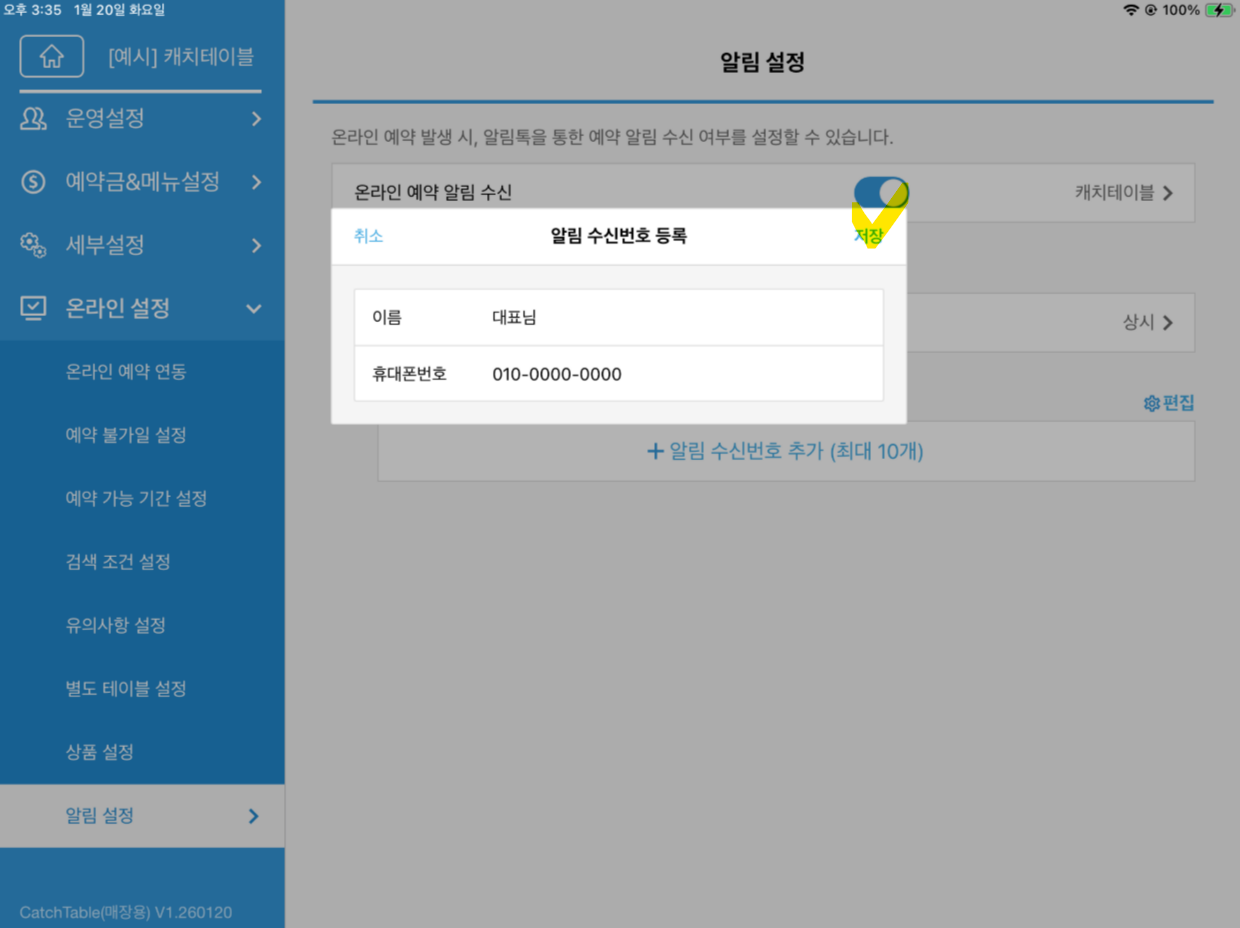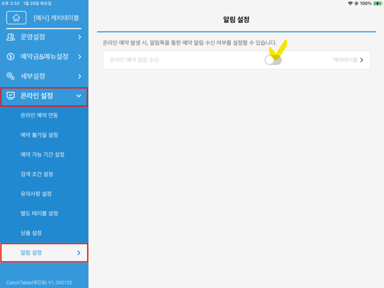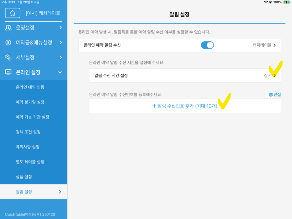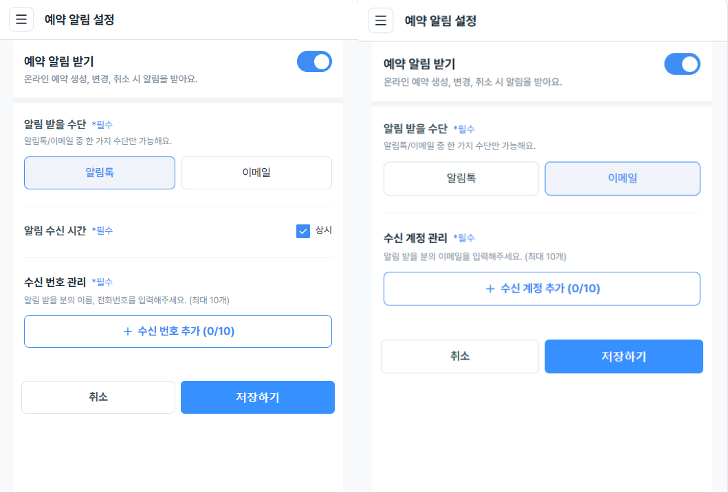 온라인 예약 발생 시, 알림 수신 여부 및 알림 받을 수단 설정이 가능합니다.