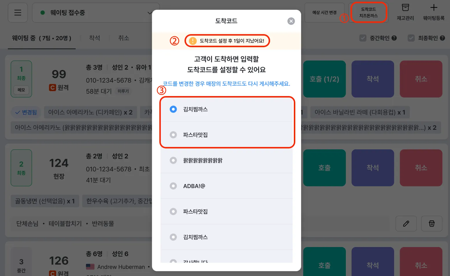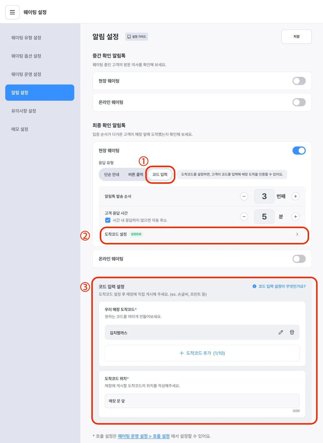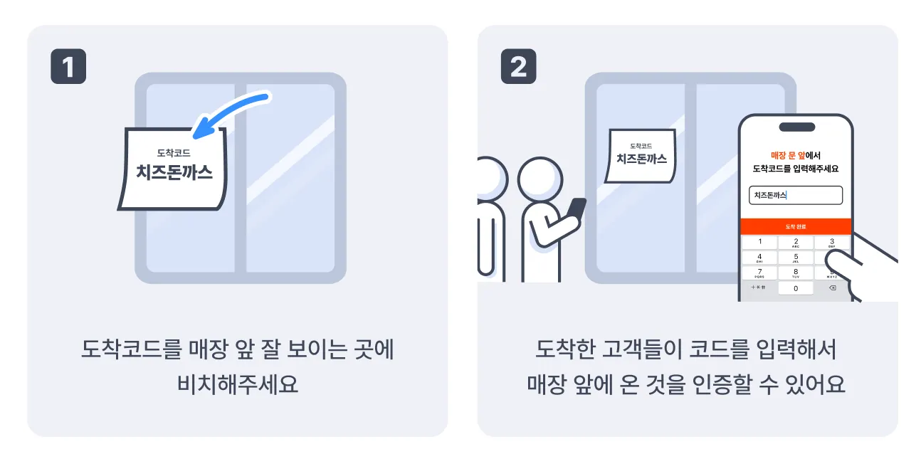 코드입력형을 사용하는 경우 우리 가게 도착 코드 및 코드 위치를 등록해주세요.