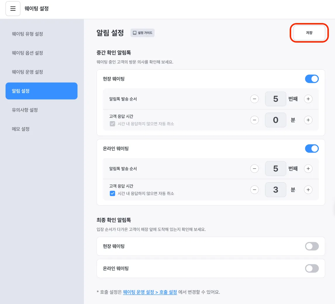 5번째입력 → 고객의 입장 순서가 5번째일 때, 알림톡 발송