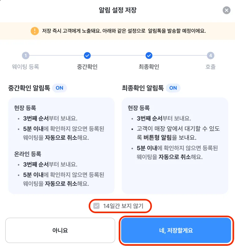 14일간 보지 않기 체크 후 저장 시 팝업창 없이 바로 저장이 가능해요.