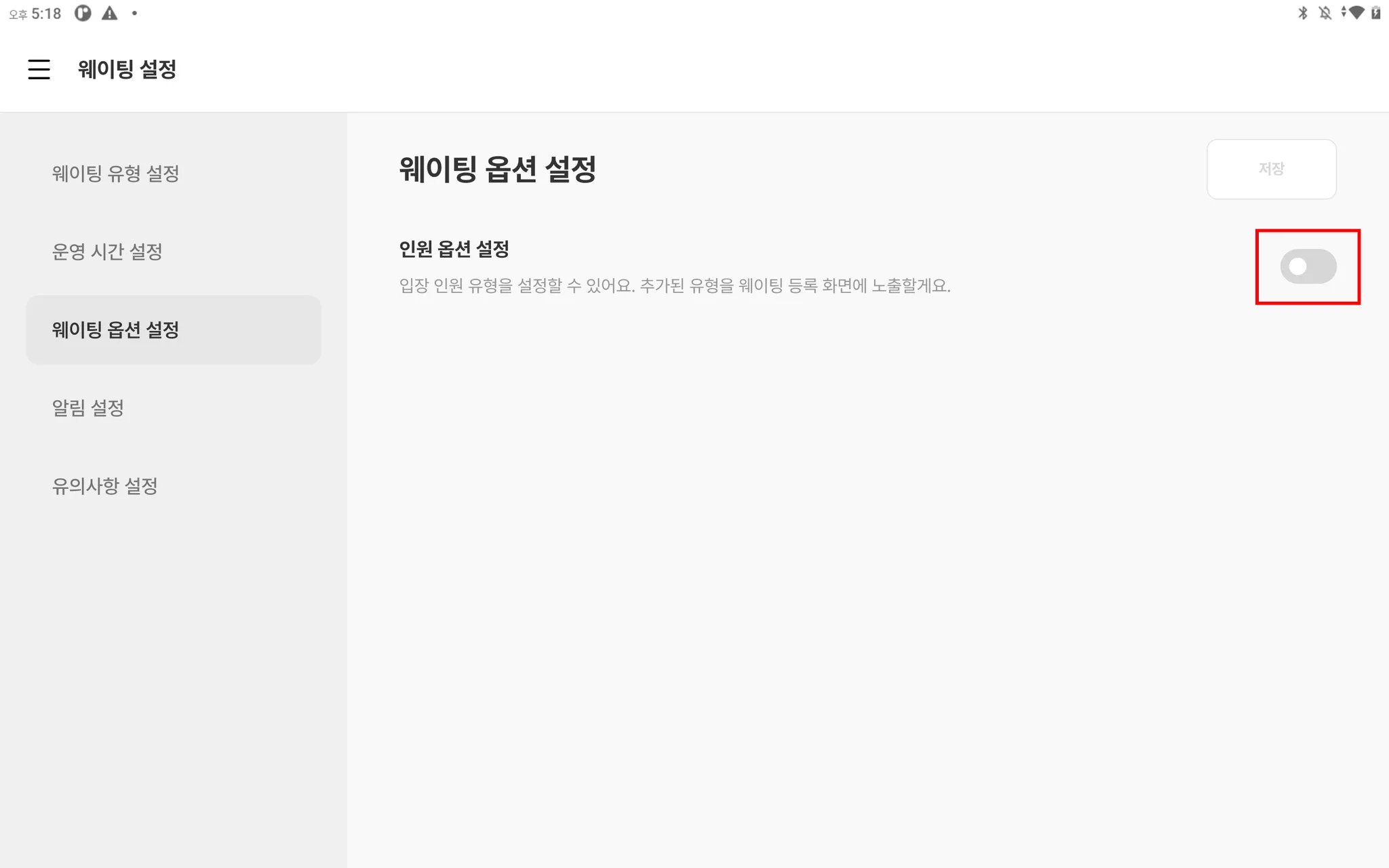 인원수옵션만 노출[ON]: 웨이팅 등록화면에서 설정한 다양한 옵션 노출