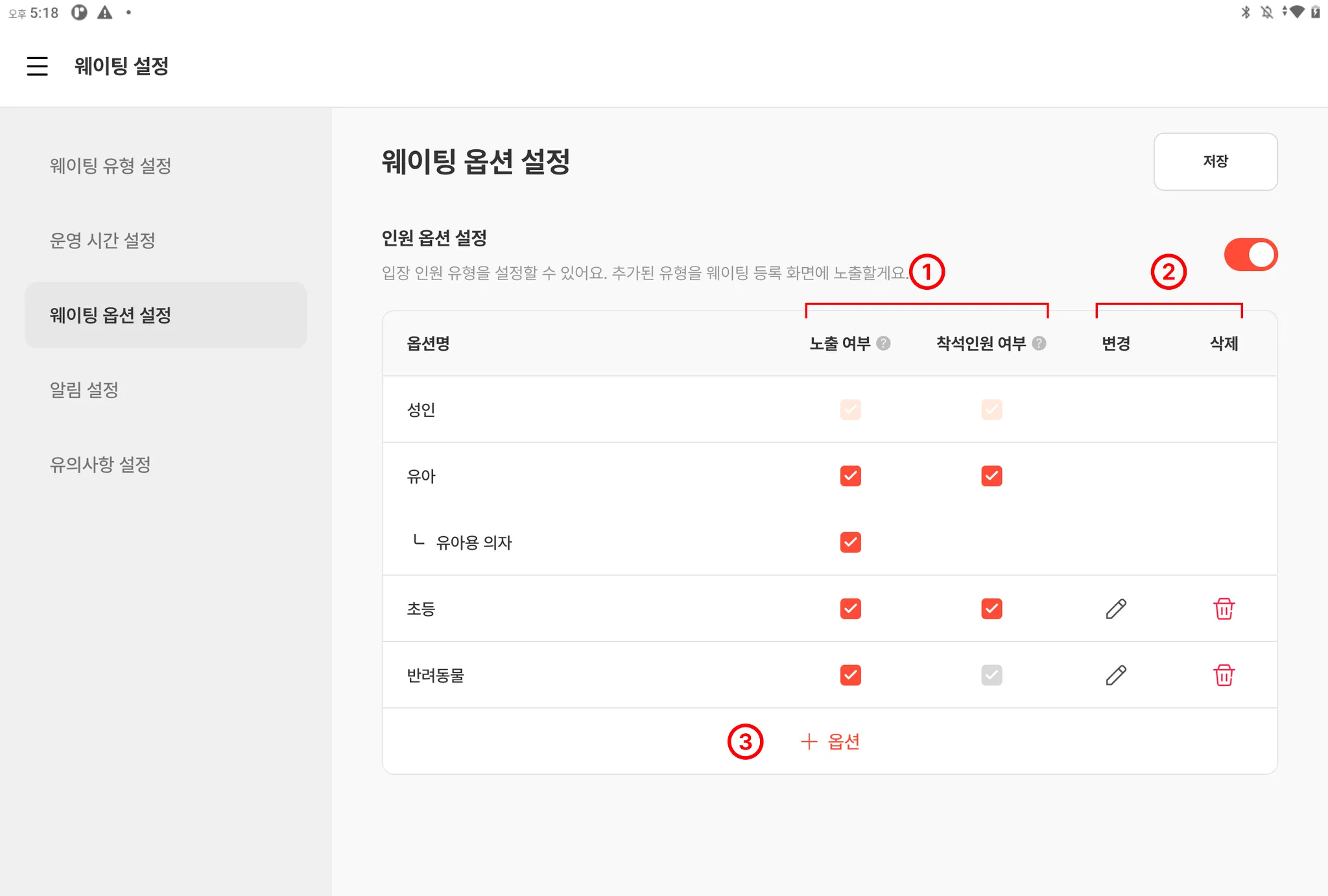 ① 옵션별 [노출 여부]와 [착석 인원] 여부를 체크해주세요.