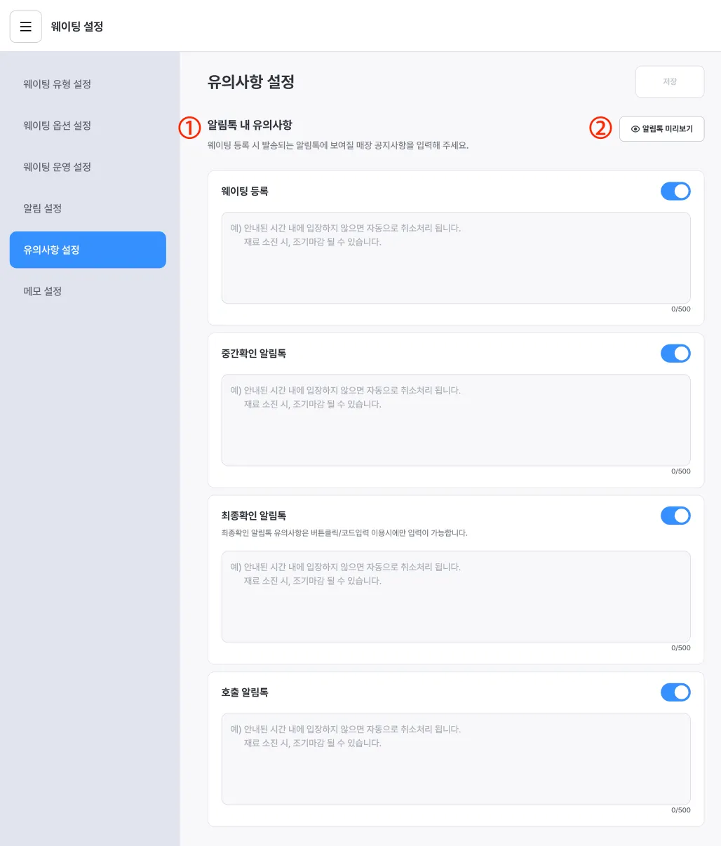 웨이팅 등록 / 중간확인, 최종확인 / 호출 시 개별 알림톡 설정이 가능해요.
