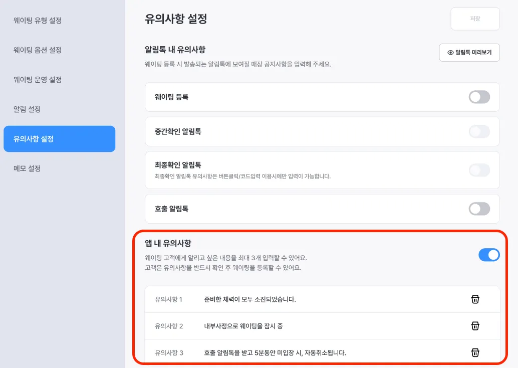 설정한 유의사항이 어떻게 발송되는지 미리보기를 통해 확인 할 수 있어요.