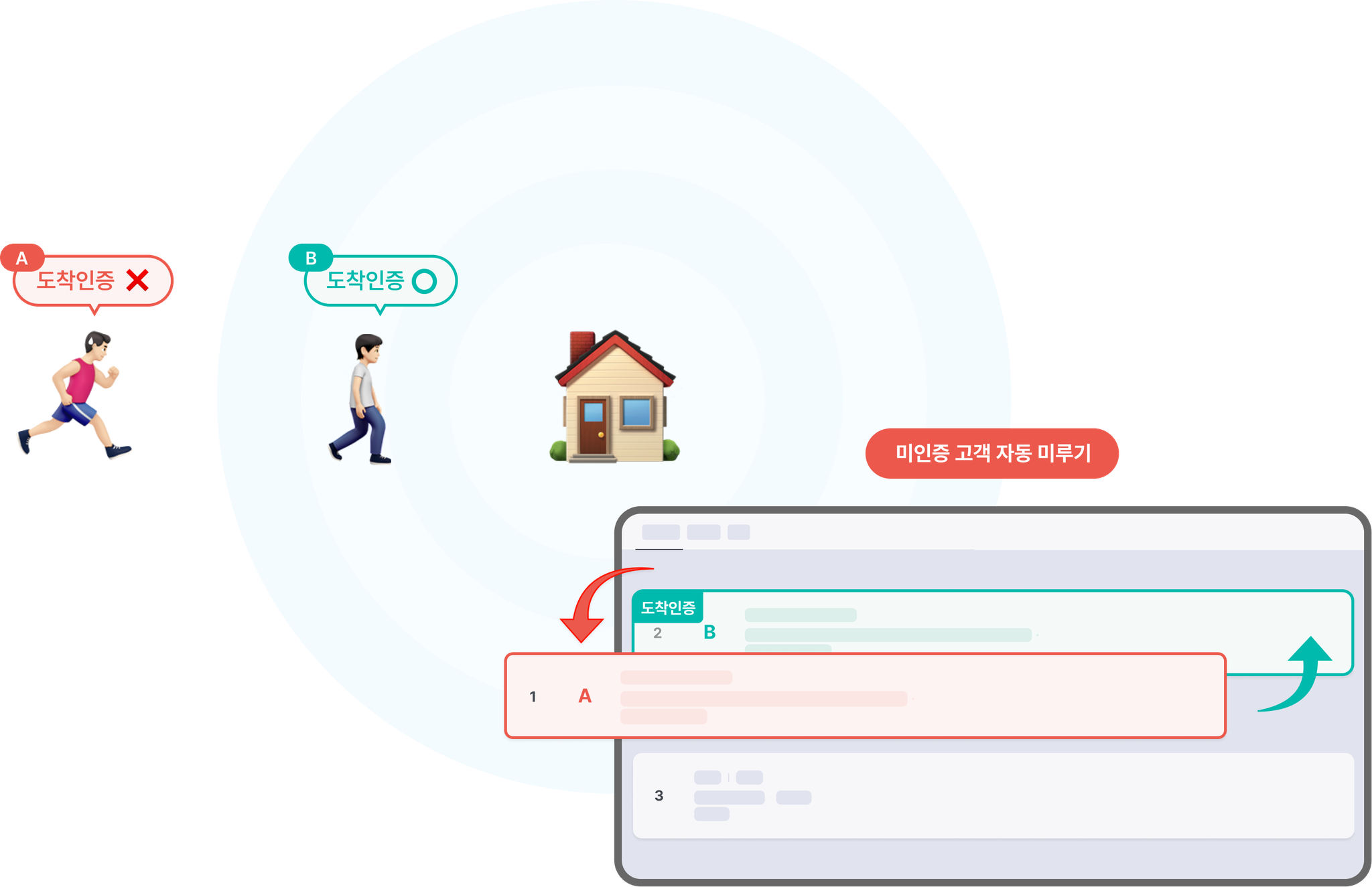 도착인증을 하지 않은 고객은 확정순번에 도달할 때까지 인증을 하지 않으면 자동으로 순번이 뒤로 밀리게 돼요. 도착인증을 진행한 다음음 순번의 고객이 앞 순번으로 조정돼요.