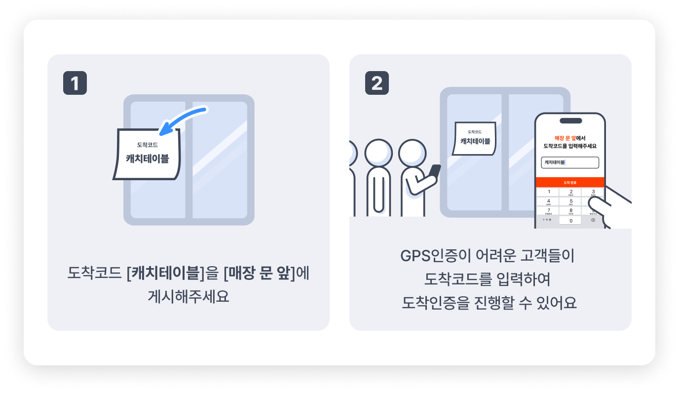 도착인증 팝업에서 위치정보를 받아오는 것에 실패했다면, 매장 앞에 게시된 도착코드로 인증할 수 있습니다.
