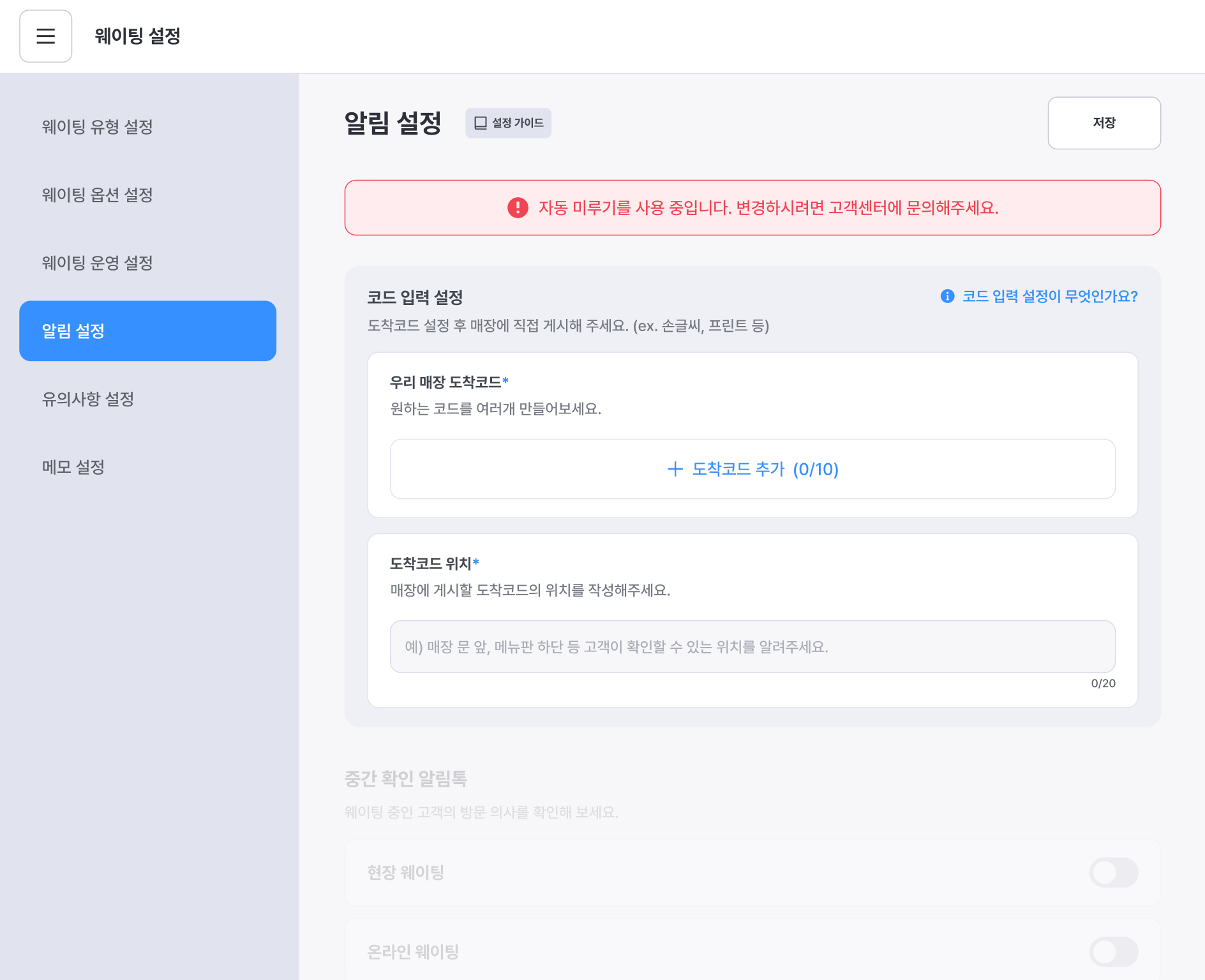 [웨이팅 설정 > 알림 설정 > 코드 입력 설정]에서 우리 매장의 도착코드와, 도착코드를 게시할 위치를 설정할 수 있어요.