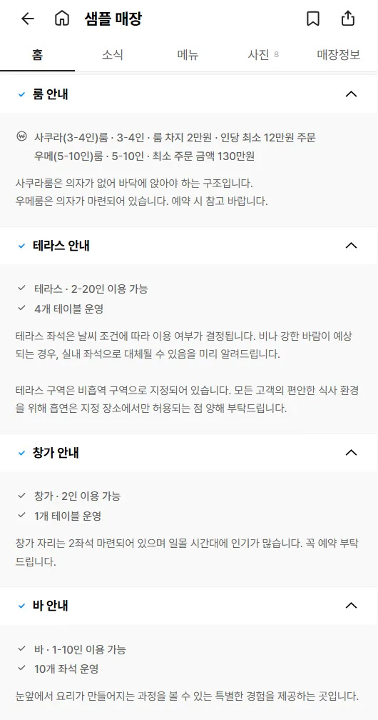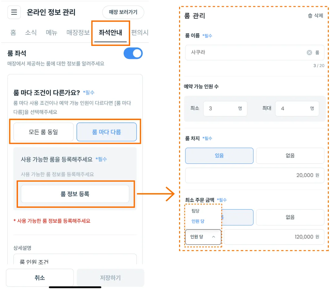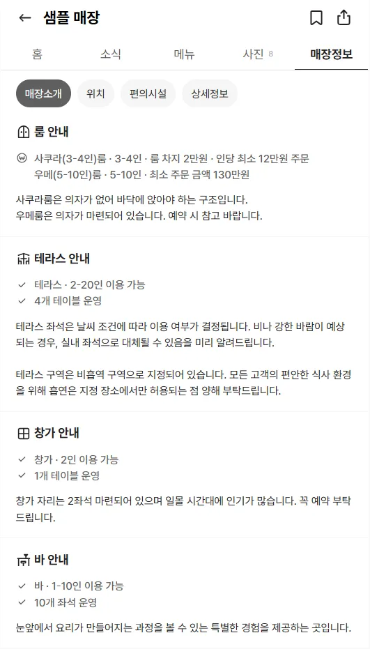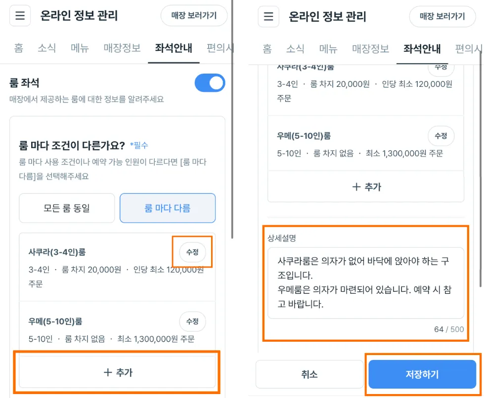 매장에서 제공하는 룸 / 좌석에 대한 정보성 문구를 매장 페이지 내