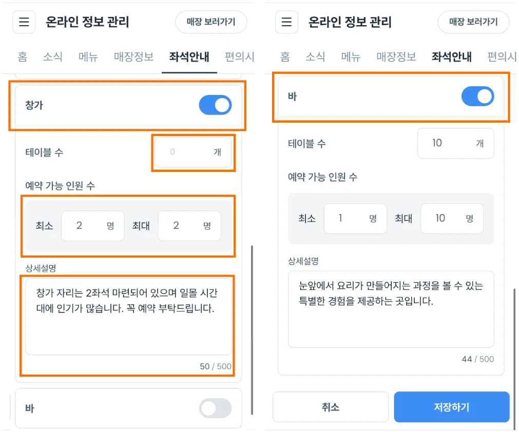 테라스, 창가, 바 타입의 정보를 입력 할 수 있습니다.