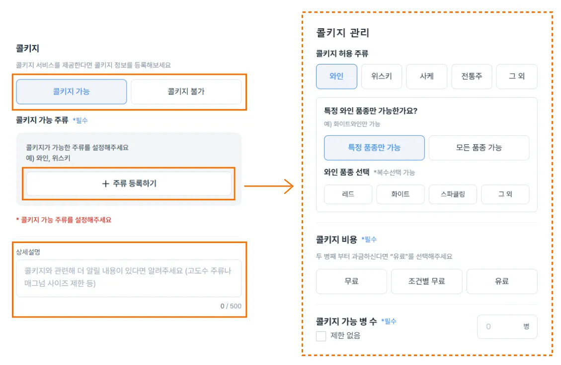 • 콜키지 가능 시 [+ 주류 등록하기] 버튼을 통해 상세 정보를 입력 할 수 있습니다.