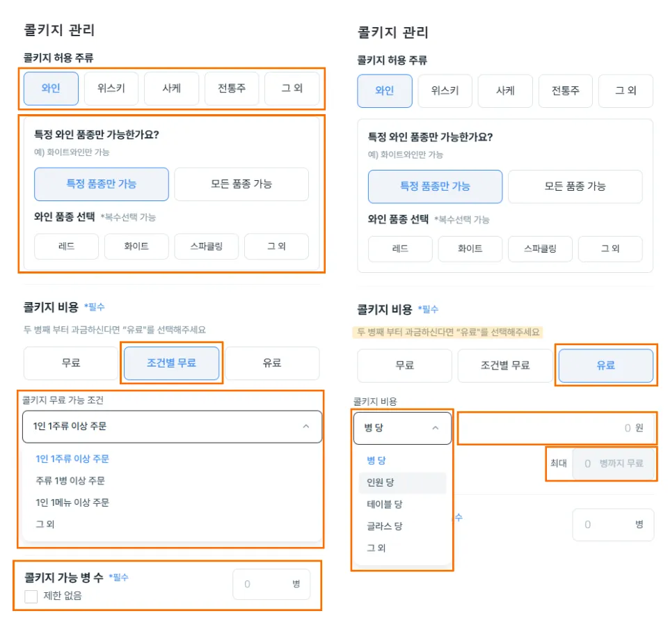 • 콜키지 비용 과금 조건을 선택 할 수 있습니다.