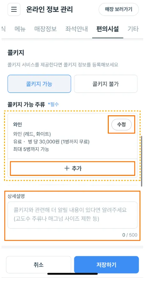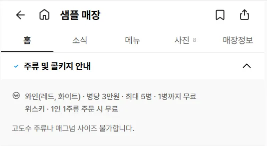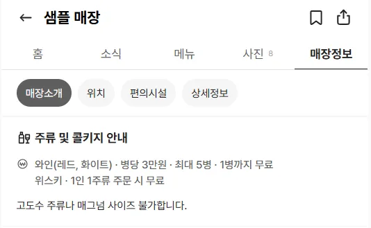 • 매장 내 콜키지 정책에 대해 등록할 수 있습니다.