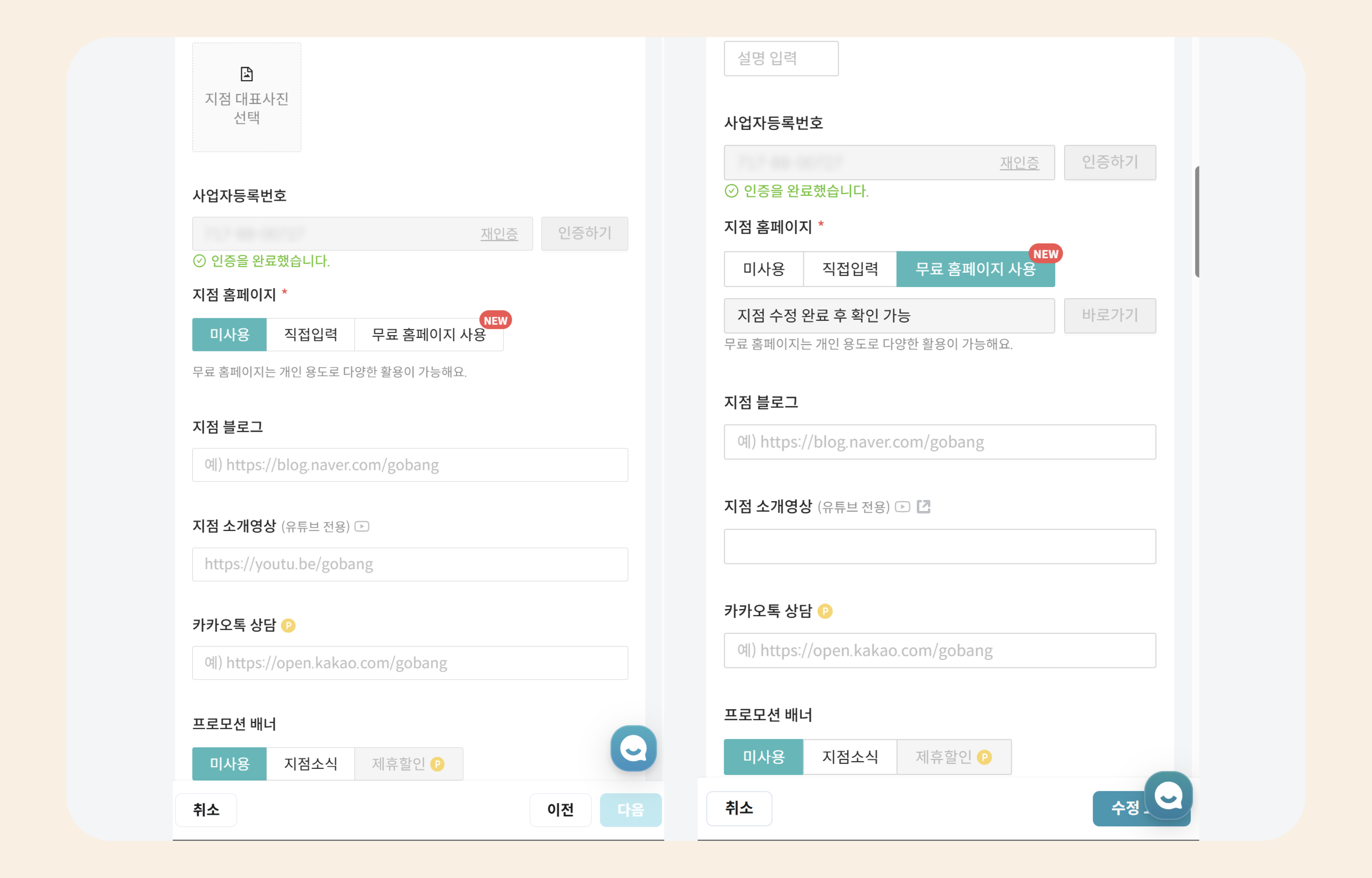 홈페이지 기능은 지점 상태/사업자등록번호 인증 여부 등에 따라 노출이 달라질 수 있어요.