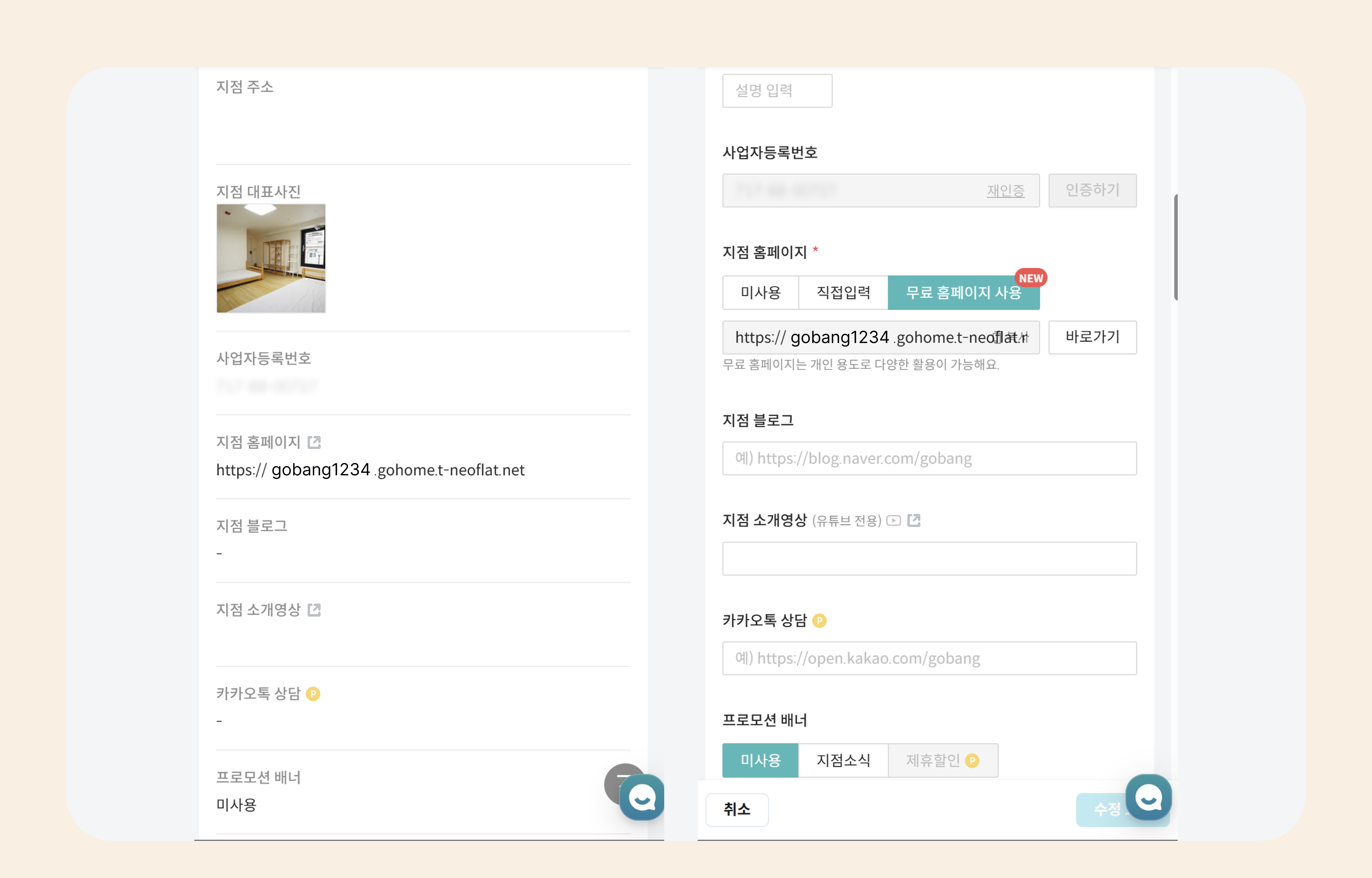수정이 승인되면, 지점 정보에서, 생성된 홈페이지 URL 정보를 확인할 수 있습니다. 홈페이지 호스트명]에는 아래 규칙으로 값을 입력합니다.