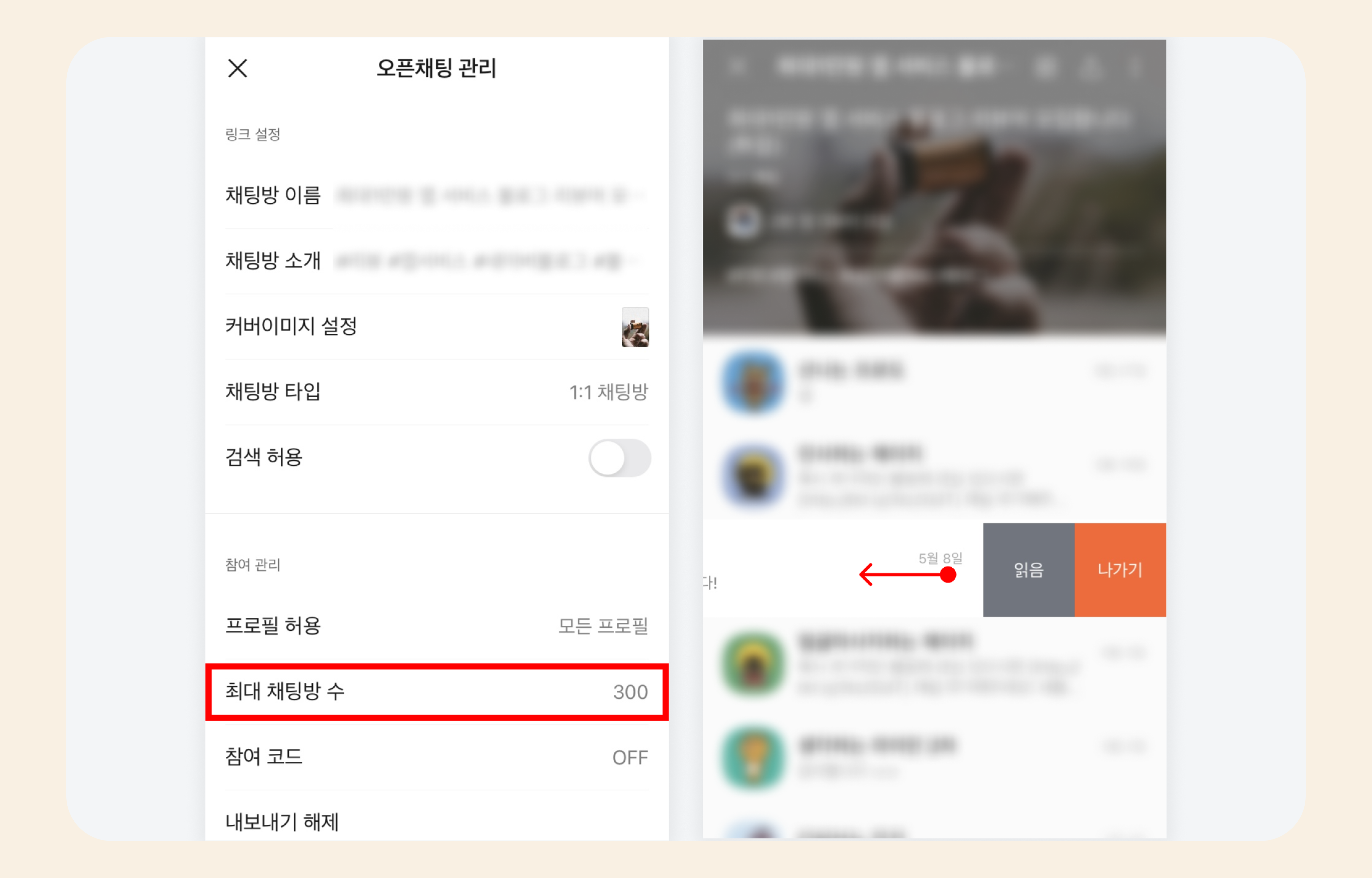 오픈채팅에 들어온 채팅방 수가 가득차면 고객 연락을 놓칠 수 있는데요. 고객 연락을 놓치지 않도록, 오픈채팅방 설정에서 [최대 채팅방 수]를 최대치(300)으로 꼭 변경하세요.