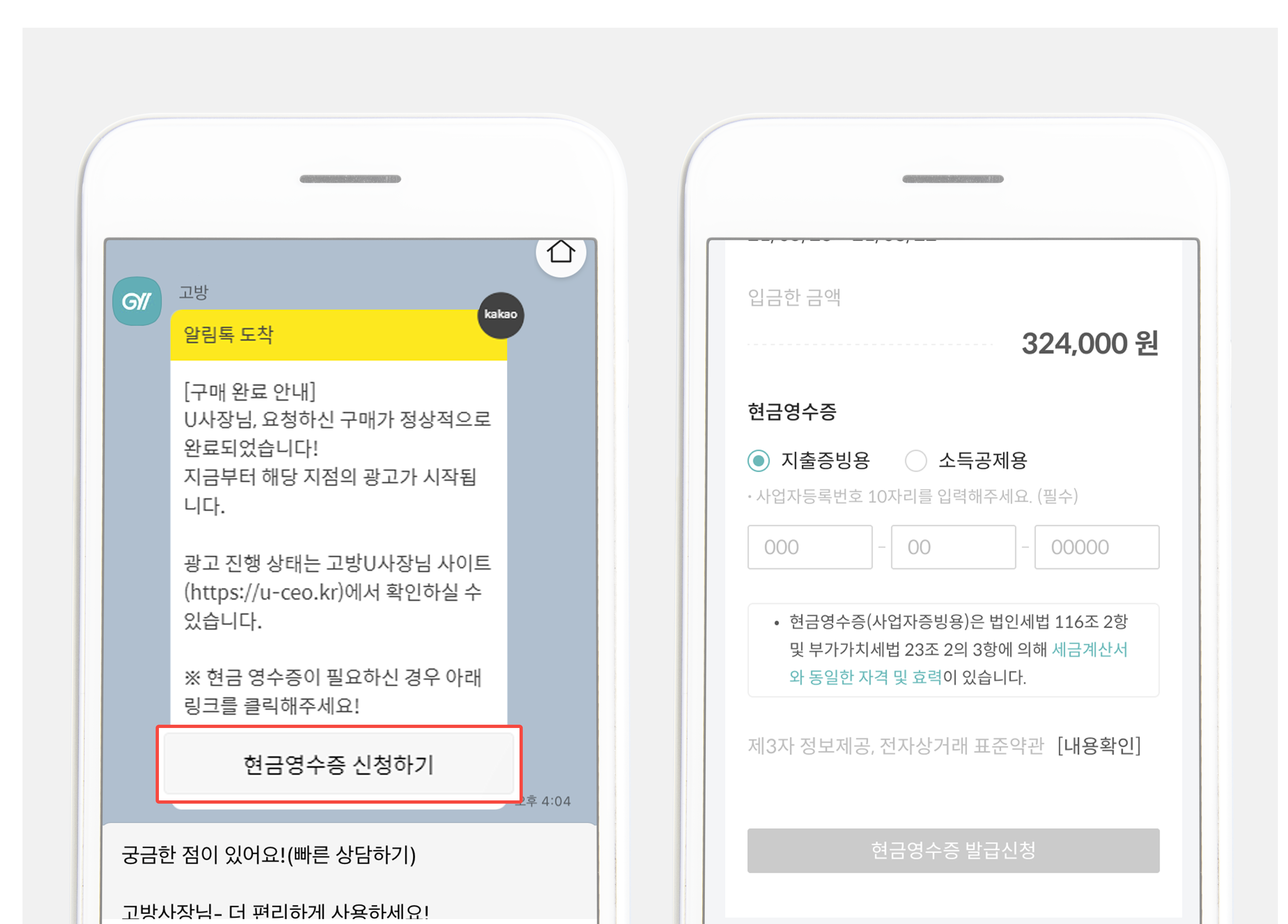 결제가 완료되고 나면 현금영수증을 발행할 수 있는 알림톡이 전송되는데요. 해당 알림톡의 [현금영수증 신청하기]를 클릭하시면 현금영수증을 발행하실 수 있습니다.