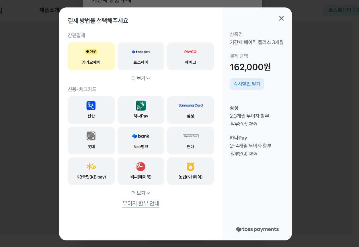 • 카카오페이, 토스페이 등 간편결제부터 신용·체크카드 결제까지 다양한 결제수단 중 원하시는 방식을 선택해 결제를 진행하실 수 있습니다.
